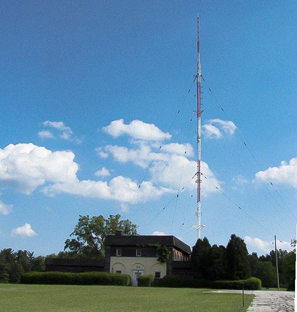 Among some of the unique features found in and around the building during that period were a fullyscreen RF shielded enclosure for RFI/EMI measurements and certification, along with an analog computer designed to produce polar performance plots for AM directional antenna arrays. There was an outdoor turntable with a ground plane, used to rotate antennas in free space for characterization measurements, as well as large vertically polarized log-periodic antennas operating in the HF band. Exotic prototype model antennas hung from the walls and ceilings inside the building, while a large searchlight mounted on the building exterior could be used to highlight the 450-foot tower at night with dramatic effect.