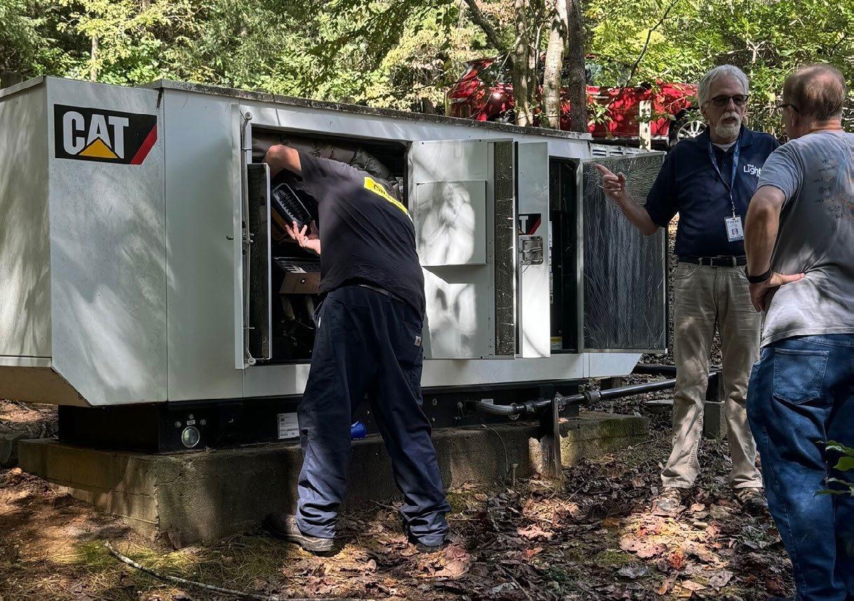 WMIT’s Steve McPeters and Keith Pittman are shown with a technician from Carolina Cat who is configuring a generator.