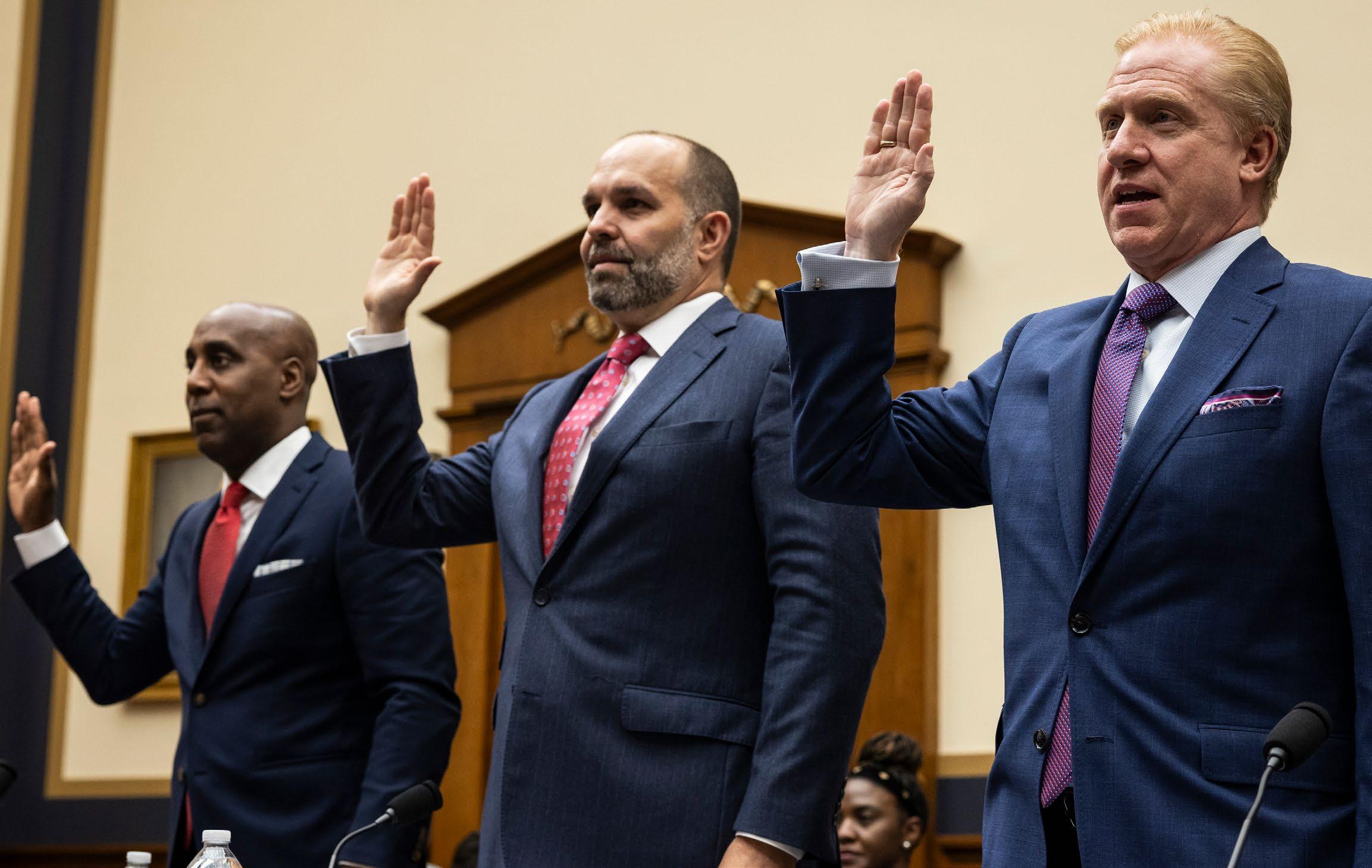 Above LeGeyt, center, testified last June before a House subcommittee about performance royalties. He is flanked by Eddie Harrell Jr. of Radio One and Michael Huppe of SoundExchange.