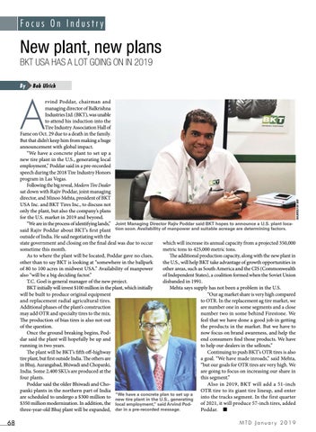 rvind Poddar, chairman and managing director of Balkrishna Industries Ltd. (BKT), was unable to attend his induction into the Tire Industry Association Hall of Fame on Oct. 29 due to a death in the family. But that didn’t keep him from making a huge announcement with global impact. “We have a concrete plant to set up a new tire plant in the U.S., generating local employment,” Poddar said in a pre-recorded speech during the 2018 Tire Industry Honors program in Las Vegas. Following the big reveal, Modern Tire Dealer sat down with Rajiv Poddar, joint managing director, and Minoo Mehta, president of BKT USA Inc. and BKT Tires Inc., to discuss not only the plant, but also the company’s plans for the U.S. market in 2019 and beyond. “We are in the process of identifying lands,” Joint Managing Director Rajiv Poddar said BKT hopes to announce a U.S. plant locasaid Rajiv Poddar about BKT’s first plant tion soon. Availability of manpower and suitable acreage are determining factors. outside of India. He said negotiating with the state government and closing on the final deal was due to occur which will increase its annual capacity from a projected 350,000 sometime this month. metric tons to 425,000 metric tons. As to where the plant will be located, Poddar gave no clues, The additional production capacity, along with the new plant in other than to say BKT is looking at “somewhere in the ballpark the U.S., will help BKT take advantage of growth opportunities in of 80 to 100 acres in midwest USA.” Availability of manpower other areas, such as South America and the CIS (Commonwealth also “will be a big deciding factor.” of Independent States), a coalition formed when the Soviet Union T.C. Goel is general manager of the new project. disbanded in 1991. BKT initially will invest $100 million in the plant, which initially Mehta says supply has not been a problem in the U.S. will be built to produce original equipment “Our ag market share is very high compared and replacement radial agricultural tires. to OTR. In the replacement ag tire market, we Additional phases of the plant’s construction are number one in some segments and a close may add OTR and specialty tires to the mix. number two in some behind Firestone. We The production of bias tires is also not out feel that we have done a good job in getting of the question. the products in the market. But we have to Once the ground breaking begins, Podnow focus on brand awareness, and help the dar said the plant will hopefully be up and end consumers find those products. We have running in two years. to help our dealers in the sellouts.” The plant will be BKT’s fifth off-highway Continuing to push BKT’s OTR tires is also tire plant, but first outside India. The others are a goal. “We have made inroads,” said Mehta, in Bhuj, Aurangabad, Bhiwadi and Chopanki, “but our goals for OTR tires are very high. We India. Some 2,400 SKUs are produced at the are going to focus on increasing our share in four plants. this segment.” Poddar said the older Bhiwadi and ChoAlso in 2019, BKT will add a 51-inch panki plants in the northern part of India OTR tire to its giant tire lineup, and enter “We have a concrete plan to set up a are scheduled to undergo a $300 million to new tire plant in the U.S., generating into the tracks segment. In the first quarter $350 million modernization. In addition, the local employment,” said Arvind Podof 2021, it will produce 57-inch tires, added three-year-old Bhuj plant will be expanded, dar in a pre-recorded message. Poddar. ■