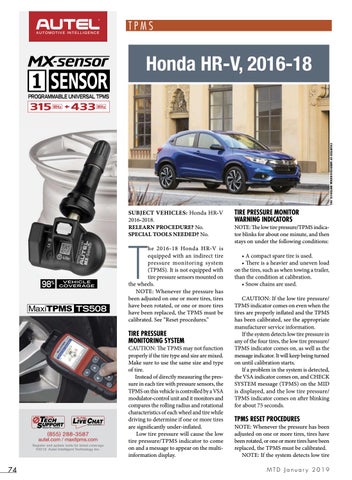 TPMS RESET PROCEDURES NOTE: Whenever the pressure has been adjusted on one or more tires, tires have been rotated, or one or more tires have been replaced, the TPMS must be calibrated. NOTE: If the system detects low tire MTD January 2019