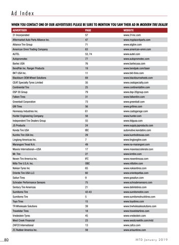 Ad Index WHEN YOU CONTACT ONE OF OUR ADVERTISERS PLEASE BE SURE TO MENTION YOU SAW THEIR AD IN MODERN TIRE DEALER