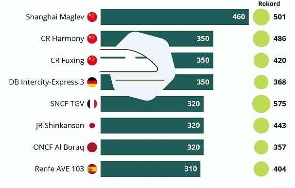 DieGrafikbildetdieHöchstgeschwindigkeitvonausgewählten HochgeschwindigkeitszügenimFahrgastbetriebab.