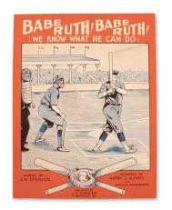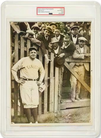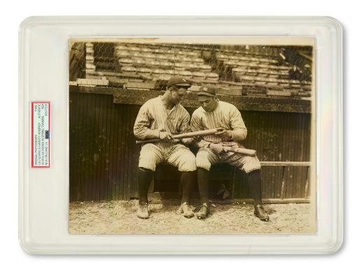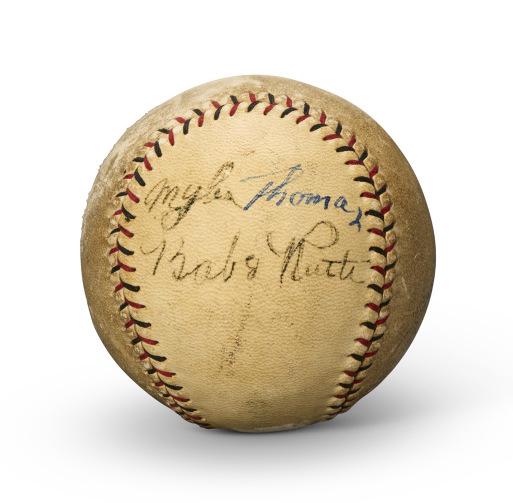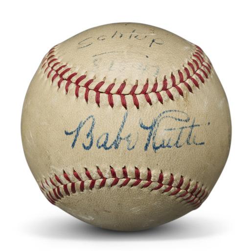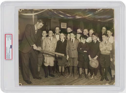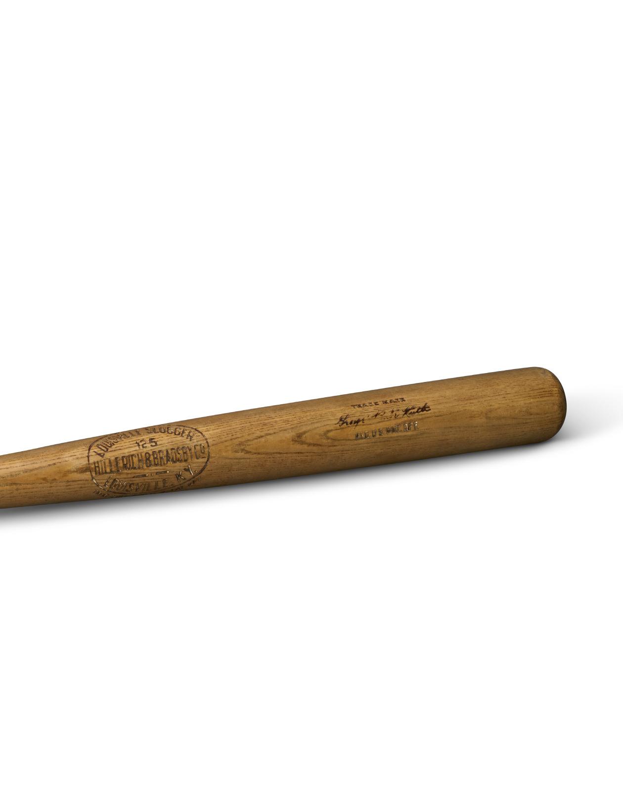 Hillerich & Bradsby 125 model bat with Babe Ruth facsimile signature impressed in the barrel measures 36" long and weighs 40oz. Uncracked with light evident use including a few ball marks on the hitting surface and a touch of grain swelling which is typically associated with repeated contact. The lower handle has some vestiges of dark material on the surface (possibly related to an aid for grip) and the knob has a large darkened circle. It is the findings of John Taube that, after close examination, the color on the knob does not cover over any prior markings. Factory ordering records indicate that bats matching the specifications of the offered example (a "Crawford" model) in both 1919 and 1920. Shortly thereafter he would transition to the R2 which he made famous. This early period in Ruth's career was pivotal with his sale to the New York Yankees formally announced in January of 1920. There he would fully transition from pitcher to slugging outfielder and change the trajectory of both his career and the game forever. Ruth would remain with the Yankees for (15) seasons leading the team through some of their most storied Championship seasons and the game’s most memorable moments. Game bats dating to these formative years are especially desirable and the offered is a fine example, made for and shipped to Ruth during the time when he became the first man in history to hit (50) home runs in a single season. Includes LOA from PSA/DNA (GU 8): EX