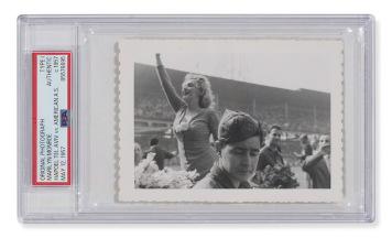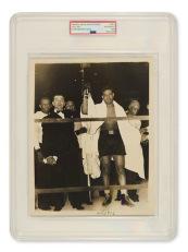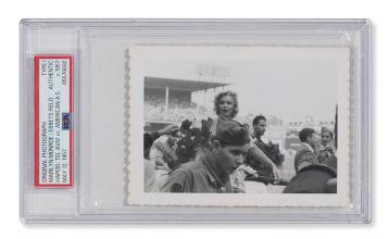 Black and white 8”x10” later period print is based on a famed photograph which was taken by noted photographer Carl Horner early in Ty Cobb’s legendary career with the Detroit Tigers. This image was utilized on Cobb’s portrait cards in the T206 series along with his Rose Company postcard, W600 and M116 Sporting Life issues, and E103 Williams Caramel card. It has been signed “Ty Cobb 9/30/57” in trademark green ink with the autograph graded PSA/DNA 10 Gem Mint. Piece itself shows a light touch to corners and edges. An exceptional and highly desirable signed photograph showcasing one of the most well-known likenesses of the noted Hall of Famer ever taken: Gem Mint