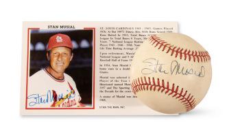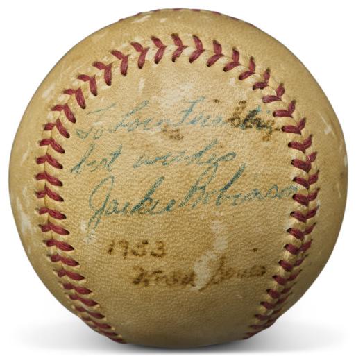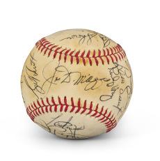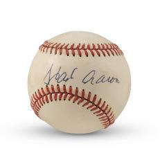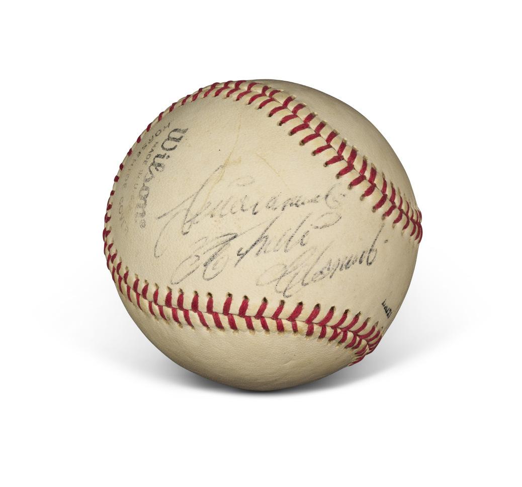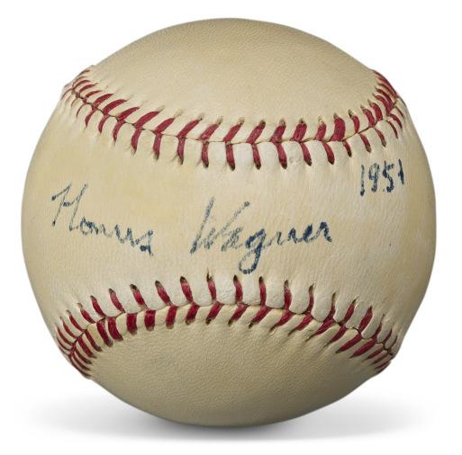 Spalding F.Frick Official National League baseball has been signed "Honus Wagner" across the sweetspot and dated "1951" in his hand. Fountain pen signature is graded "6" by PSA. While technically accurate, the grade alone fails to convey the overall eye appeal and display value of the signature. League stampings remain bold and well defined and there is light even toning to the surface. Includes the original box (wear throughout and a side panel is missing) which bears a handwritten notation reading, "This ball autographed by Honus Wagner in his house, 605 Beechwood St Carnegie PA" with "Sept 19 - 1951" date above. In the company of the very best examples to have been offered at auction in decades with scarce and desirable sweetspot positioning. Wagner ranks among the most revered and important figures in the history of early 20th Century baseball and single signed baseballs of any type are among the most desirable within the genre. Includes full LOA from PSA/DNA (autograph graded 6): Ball EX/MT, Sig. PSA 6, Box PR
