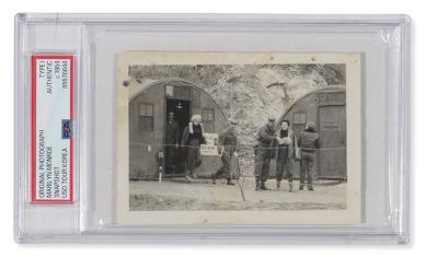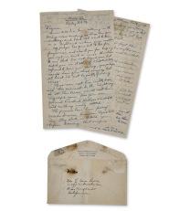 Typical fold lines from mailing along with toning and some additional wear. A large tear (running from around the center down to the bottom edge) is secured from behind with tape. Comes with the original mailing envelope (which likewise depicts Wagner) and a 1957 dated letter from an autograph dealer who brokered the piece to a client. One of the finest content Hall of Famer handwritten letters we have had the pleasure of offering. Authenticated and encapsulated by PSA with the autograph graded PSA/DNA 8 NM-MT: Auto NM-MT, Letter FR