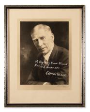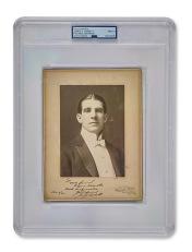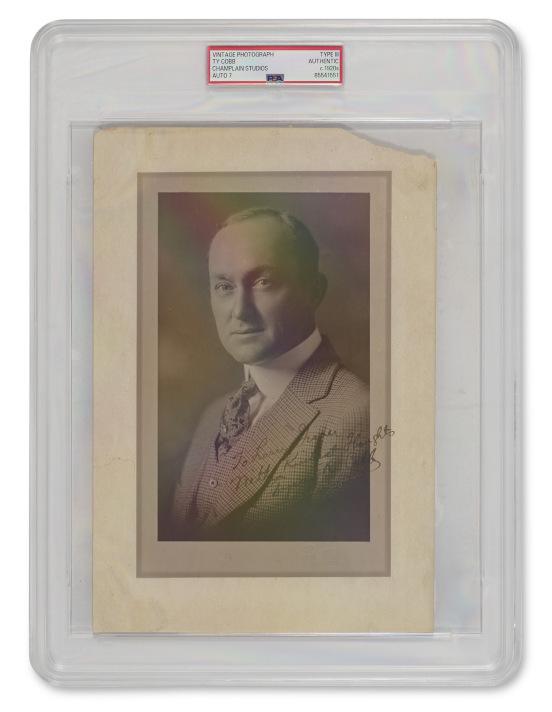 Striking sepia tone 6.75"x10" portrait photograph has been signed "To Larry Grear, With Kindest Thoughts, Tyrus R. Cobb." Fountain pen signature is graded "NM 7" by PSA. "Champlain Studios" raised seal appears at lower right corner. Wear is confined to the borders with a large chip to the upper right and a tear at lower left. When framed for display all damage could be matted out with the display area showing only a touch of light toning. Authenticated and encapsulated by PSA as "Type III": Sig. PSA 7 NM, Photo GD