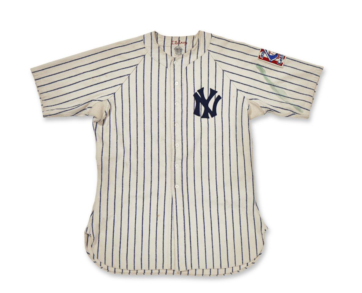 rather than being relinquished to use in Minor League play. Some of the most important surviving examples of historic baseball jerseys were preserved in this fashion to include Babe Ruth, Lou Gehrig, Mickey Mantle, and Jackie Robinson. In the summer of 1991, Lou Gehrig’s 1939 New York Yankees home jersey made its debut within the hobby. The jersey had been originally preserved by a dry cleaner who was tasked with cleaning the uniforms for the Newark Bears who were an affiliate of the Yankees. Noticing that Lou Gehrig’s jersey was among those headed for Minor League use the cleaner coveted the final home shirt worn by the Iron Horse and retained it for over 50 years. In 1991, the jersey was sold to a prominent New York dealer who then entered into an agreement for a private treaty sale to Dr. G.B. Espy through a representative at the price of $115,000. A princely sum, at the time. For context, between 1991 and 1992 two examples of the famed 1909-11 T-206 Honus Wagner card were sold for $220,000 (VG-EX copy) and $451,000 (Finest known PSA 8 NM-MT copy) which would now garner estimated values of $5-$10,000,000 and $25-$50,000,000 respectively. Dr. Espy held the jersey as his most cherished possession among his various collections of important Sports, Entertainment, and Americana categories.