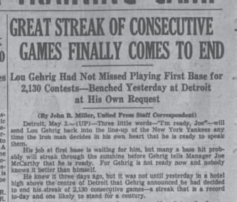 speculation that he should be removed from the Yankees lineup. The next day was a day off, before the team would open a series in Detroit against the Tigers. On May 2, 1939, Lou Gehrig sought out Yankees manager Joe McCarthy in the Book Cadillac Hotel in Detroit. Arthur E. Patterson recounted the meeting in the New York Herald Tribune: "Joe, I'd like to talk to you," Gehrig said. "Sure thing, Lou. C'mon around the corner here and sit down," McCarthy said. "Joe, I'm not helping this team any," Gehrig said. "I know I look terrible out there. This string of mine doesn't mean a thing to me. It isn't fair to the boys for me to stay in there. Joe, I want you to take me out of the lineup today." While it was difficult for Gehrig's longtime friend and manager to hear, McCarthy understood Gehrig's intentions and granted his request. At the insistence of Gehrig himself, in what has become one of the more legendary and poignant moments of the era, Gehrig mandated that he be permitted to deliver the lineup card to home plate on May 2, 1939 without his name written in the starting nine. On that date, when Lou Gehrig unexpectedly walked to home plate to deliver the lineup card, the umpires, according to period news accounts, were "stunned" to see that Gehrig was not in the lineup. Preceding the game, the Detroit Tigers announcer revealed to the crowd at Briggs Stadium, "Ladies and gentlemen, this is the first time Lou Gehrig's name will not appear on the Yankee lineup in 2,130 consecutive games." During the announcement, Lou Gehrig sat on the Yankees bench with tears in his eyes, almost as if he himself knew that his body was failing. John Kieran of The New York Times wrote, "So they unhitched the Iron Horse from the old wagon, but Marse Joe McCarthy didn't order him to be taken behind the barn and destroyed." Although there had been no foe on the baseball diamond to challenge Gehrig's prowess, he would now begin a fight the likes of which he had