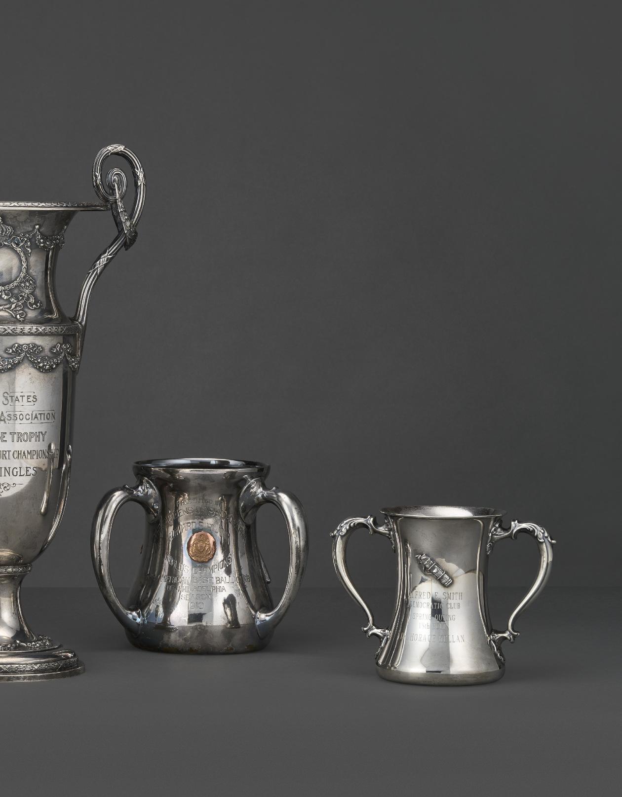 Bombé-form with three loop handles, applied on one side with the seal of the city of Philadelphia in copper and engraved PRESENTED BY THE CITIZENS OF PHILADELPHIA TO EDWARD S. PLANK WORLD'S CHAMPIONS THE AMERICAN BASEBALL CLUB OF PHILADELPHIA SEASON 1910, further applied on the other two sides with cross bats above a baseball, and with an enamel pennant with the logo of the Philadelphia Athletics, marked on underside