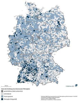 Abwärmequellen und effiziente Technologien am besten nutzen lassen. Die Pläne erfassen dabei das gesamte Gemeindegebiet. Ziel ist es, langfristig tragfähige und verlässliche Entscheidungsgrundlagen für Kommunen, Energieversorger, Wirtschaft und private Haushalte zu schaffen. Die Analyse „Wärmewende in Deutschland: Kommunale Wärmeplanung im Überblick“ ist hier abrufbar: https://www.bbsr.bund. de/BBSR/DE/veroeffentlichungen/sonderveroeffentlichungen/2025/waermewendein-deutschland.html