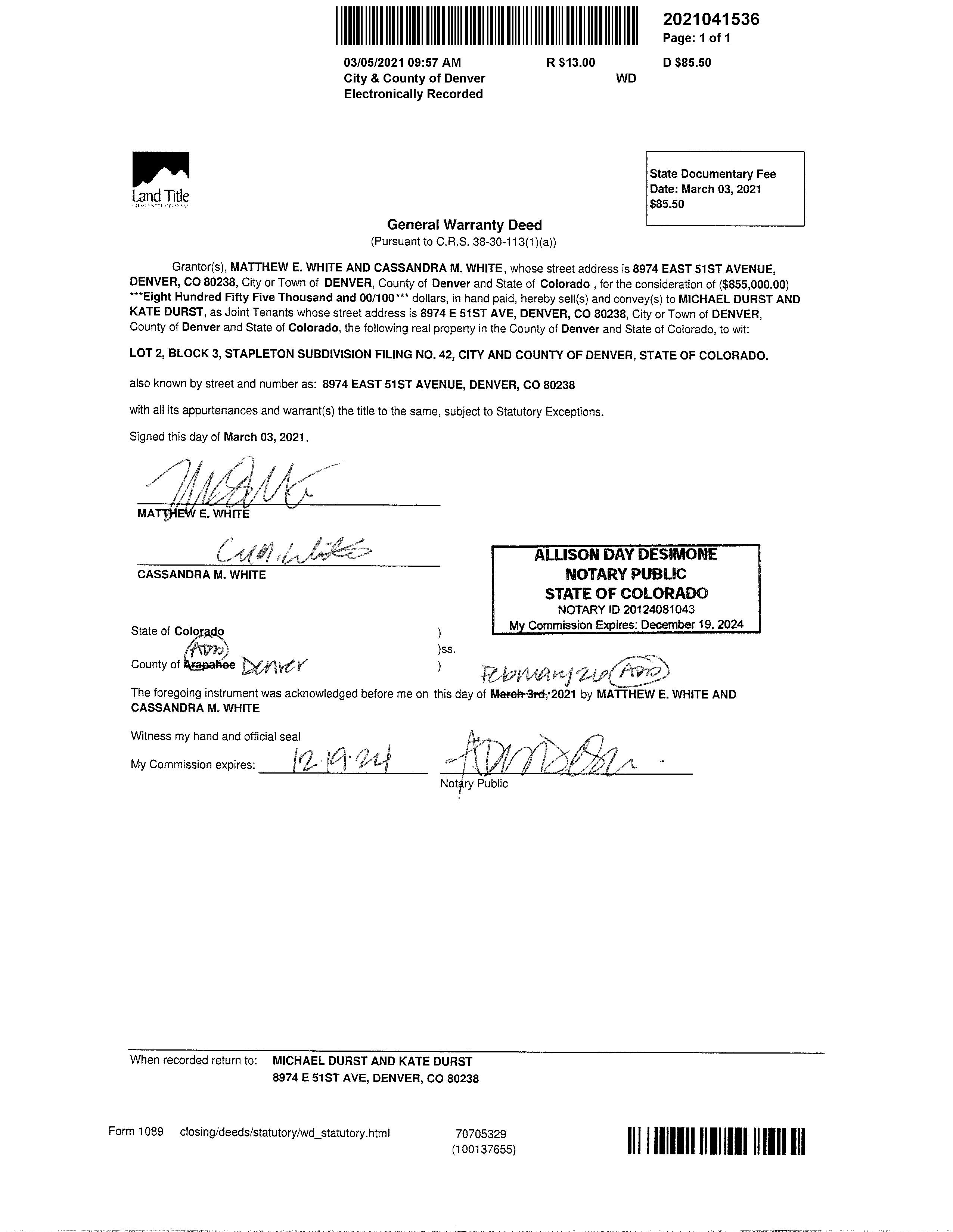 Buyer : Durst Michael & Kate White Matthew E & Cassandra M