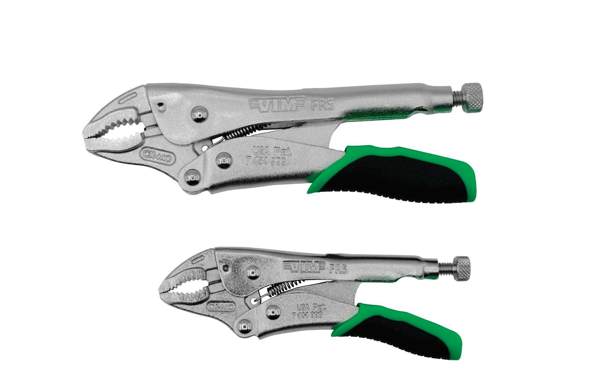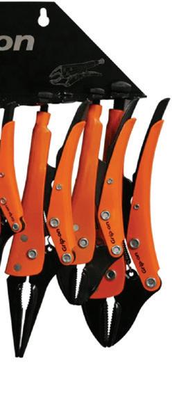 The Grip-on 10-pc Essential Locking Pliers Set , No. EK-SET10, from Dynamic Tools includes 10 essential designs and sizes to be employed where strong, temporary grip is needed. The epoxy resin coating is 10 times more corrosion resistant than nickel and provides superior resistance to welding spatter. No pinch easy release lever eliminates painful accidental pinching of hands and fingers. Drop-forged jaws ensure long-term durability. A piano wire spring ensures superior tool life and reliable opening and closing of tool. Improved design reduces the gap between the lever and handle, protecting the spring from damage. Includes a metal storage rack. For more information, visit VehicleServicePros.com/55294664