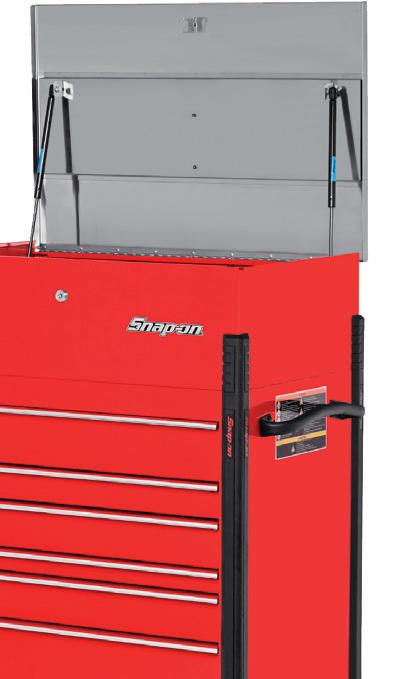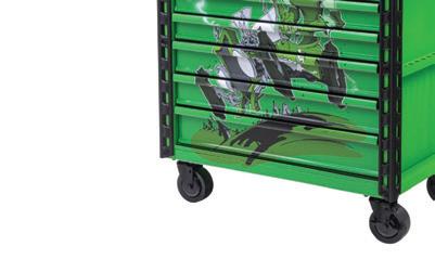 The Mac Tools Promotional Vinyl Wrapped 7-Drawer Drop-Top Cart with 49” Vertical Power Drawer features a vertical PowerTech drawer with adjustable tool holders and an integrated power strip. It features a drop-top compartment with pry bar storage and an additional power strip, and utilizes blowmolded bumpers to protect against damage. Each drawer has a 100-lb capacity, and the cart itself is on 6” casters with a 1,000-lb capacity.