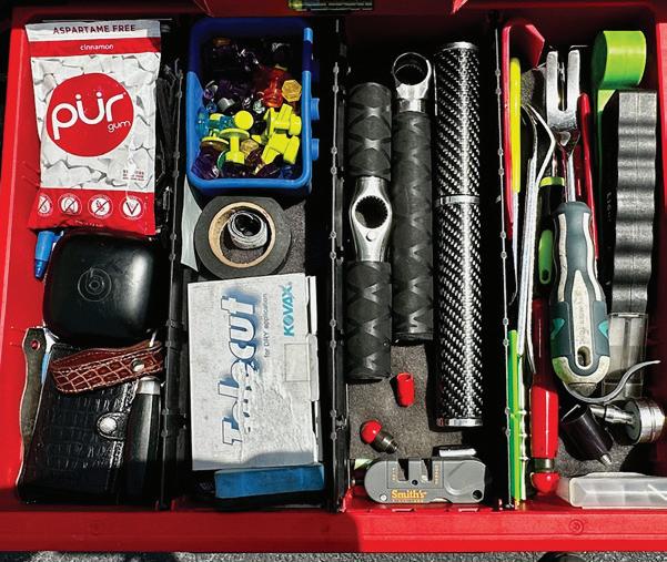 Tool organization is another area where Swyers excels. He uses a Willie Quick top tray system that locks into the Milwaukee PACKOUT cleats, offering dedicated spaces for his mostused tools. “When I’m done with a job, I can glance at the tray and instantly tell if something’s missing,” he says. This visual inventory system helps prevent lost tools and streamlines his workflow.