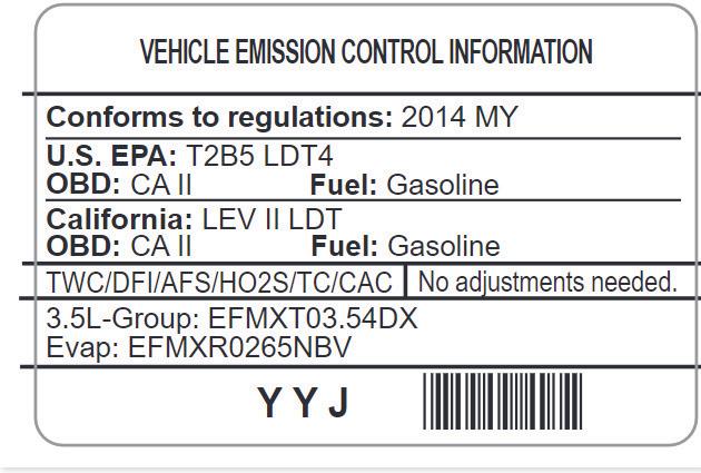 Conformstoregulations: 2015 Fuel: Gasoline U.S.EPAclass/stds: LDV/TIER2 Californiaclass/stds: PC/ULEVqualified Group 0180111.2L