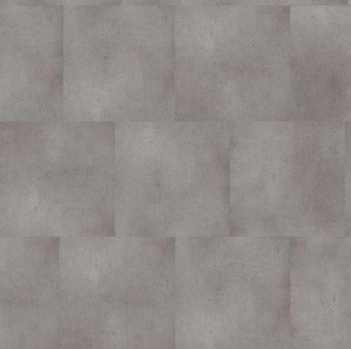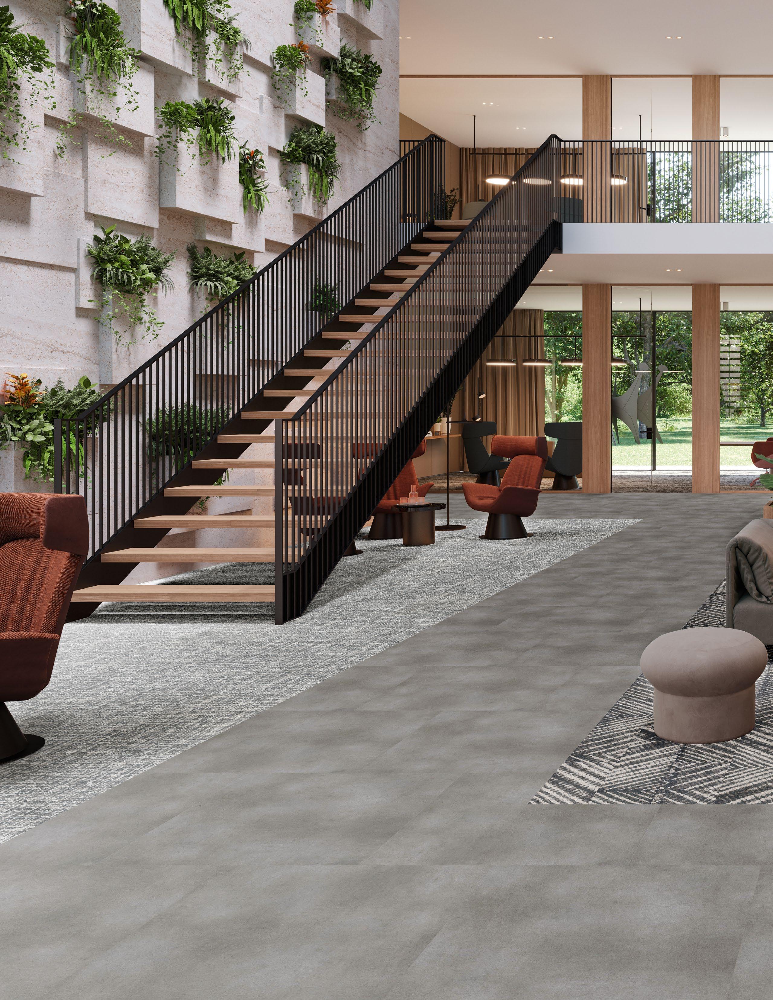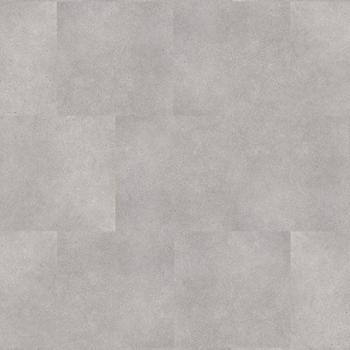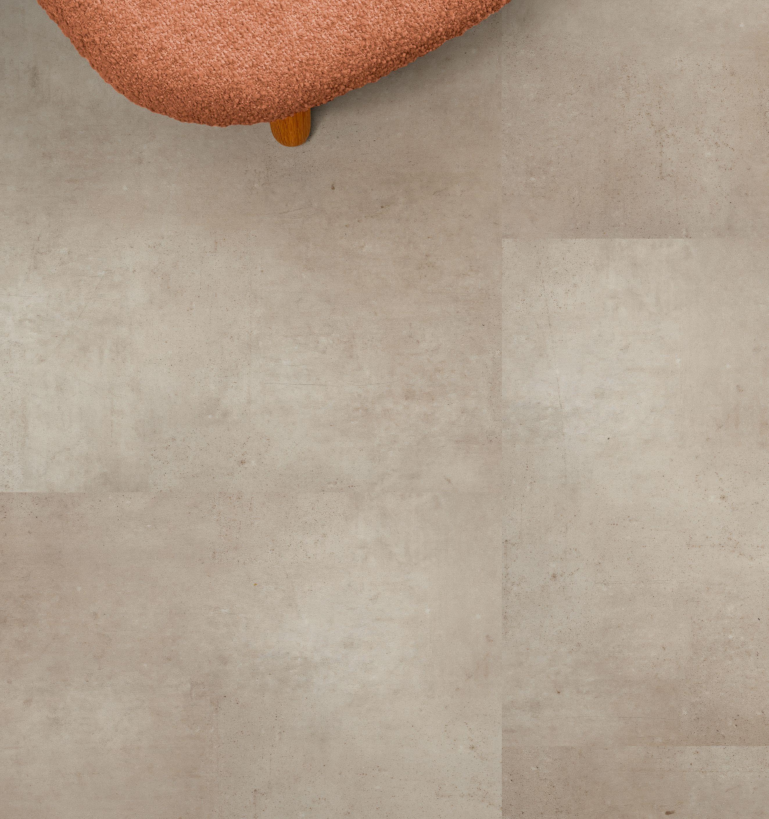 The inherent beauty of concrete elevates the visual for a minimal, classic appeal. Flow LVT: available in 2.5 mm 46 x 46 cm direct glue and 5.0 mm 91 x 91 cm loose lay options.