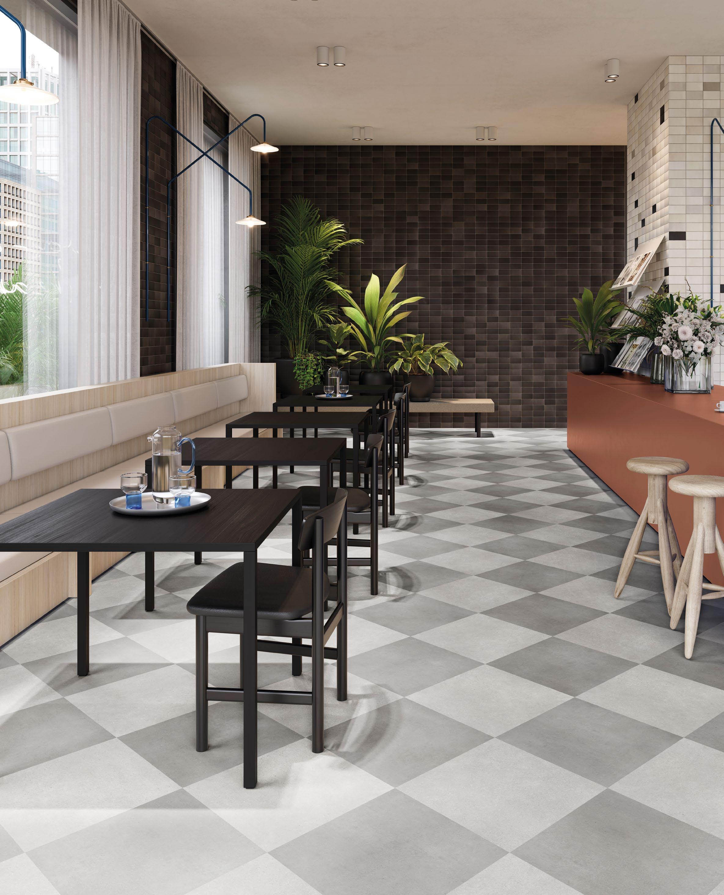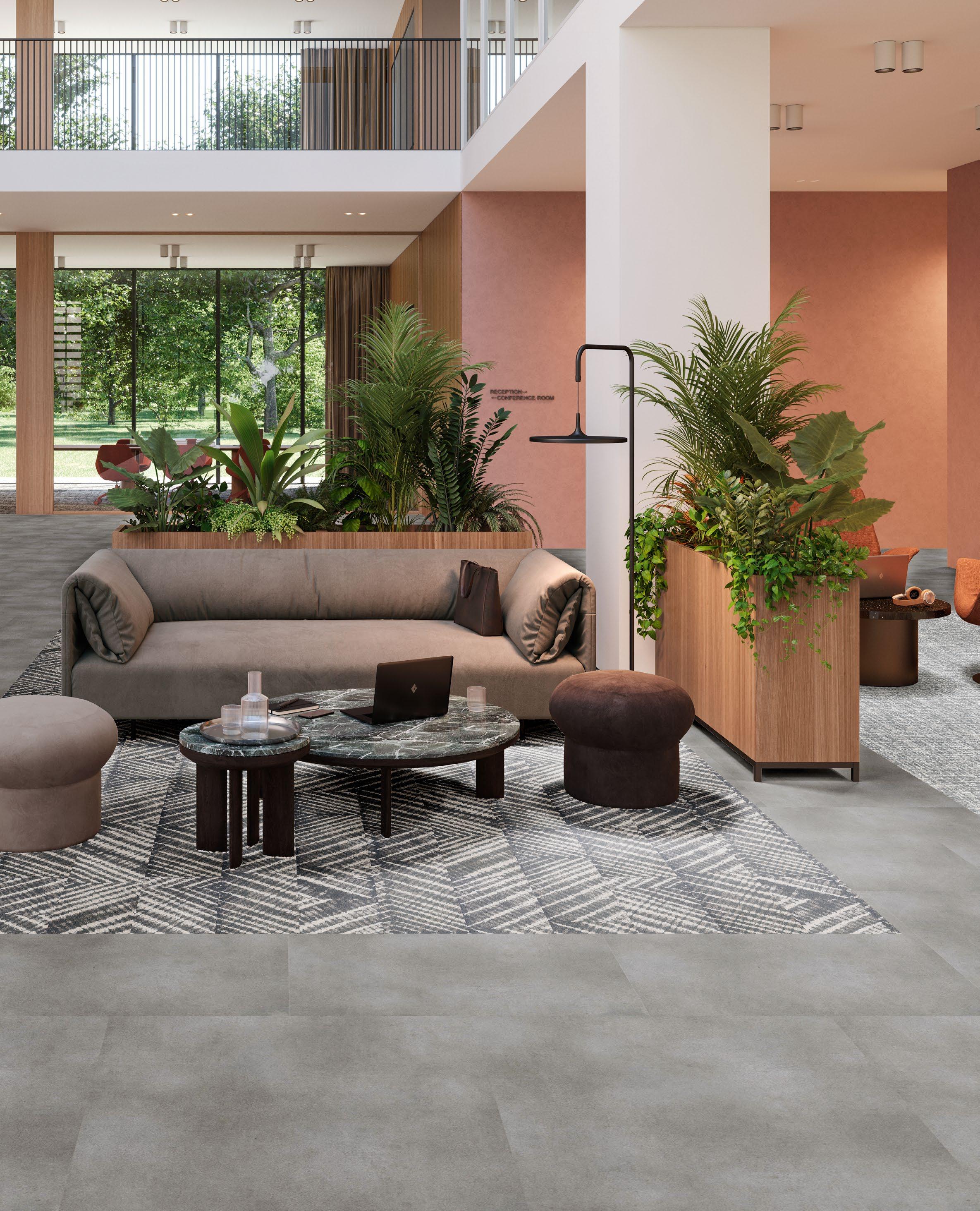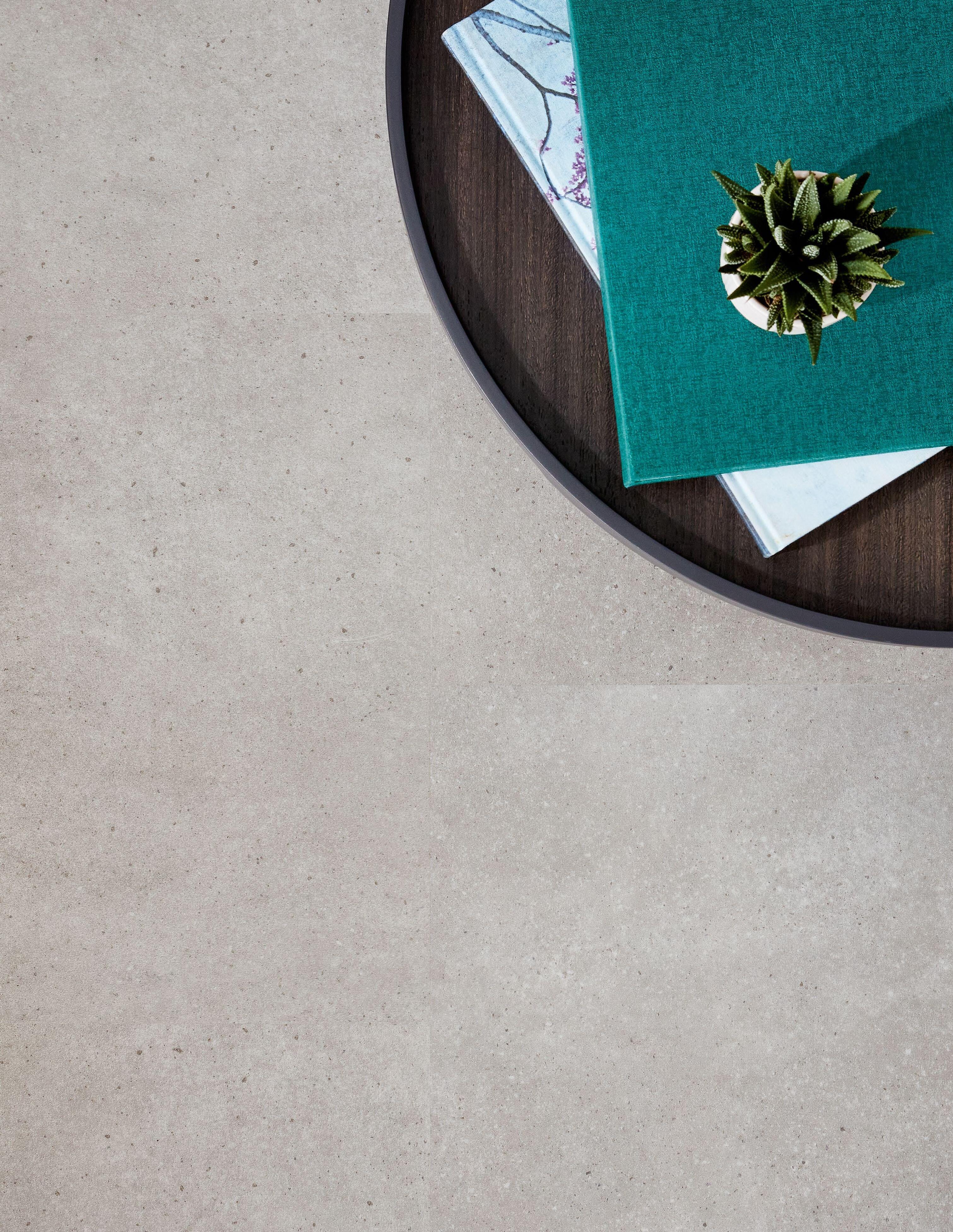 The inherent beauty of concrete elevates the visual for a minimal, classic appeal. Flow LVT: available in 2.5 mm 46 x 46 cm direct glue and 5.0 mm 91 x 91 cm loose lay options.