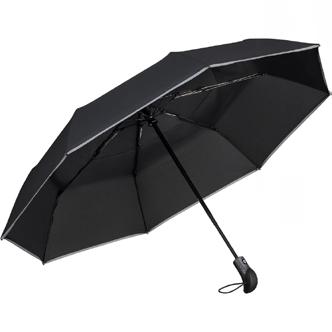 Convenient automatic open/close function for quick opening and closing, high-quality Windproof PLUS system for maximum frame flexibility in strong gusts of wind, flexible fibreglass ribs, Overlapping ventilation cover to regulate excess pressure caused by strong gusts of wind gusts, water-saving coloured polyester pongee waterSAVE® cover material made from recycled plastics and with fashionable reflective piping in silver, with waterSAVE® label on the closing strap, stylish handle made from recycled ABS with integrated push-button.