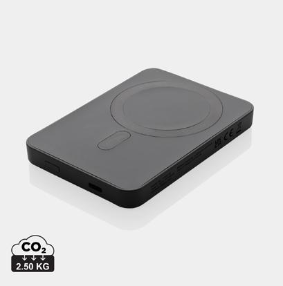 5.000 mAh pocket size powerbank with 5W magnetic wireless charger with a case made out of RCS certified recycled ABS plastic. RCS (Recycled Claim Standard) is a standard to verify the recycled content of a product throughout the whole supply chain. Total recycled content: 20 % based on total item weight.The powerbank contains a long lasting grade A 5.000 mAh lithium polymer battery. The power indicators will indicate the remaining energy level so you always know when to re-charge.; Type-C Input