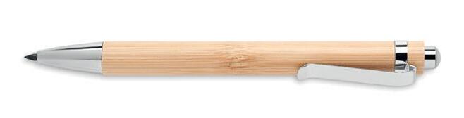 Long lasting push button inkless pen with bamboo barrel and shiny chrome fittings. The pen writes with the graphite tip. Bamboo is a natural product, there may be slight variations in colour and size per item, which can affect the final decoration outcome.