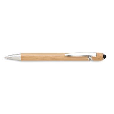 Stylus push button ball pen with bamboo finish. Blue ink.