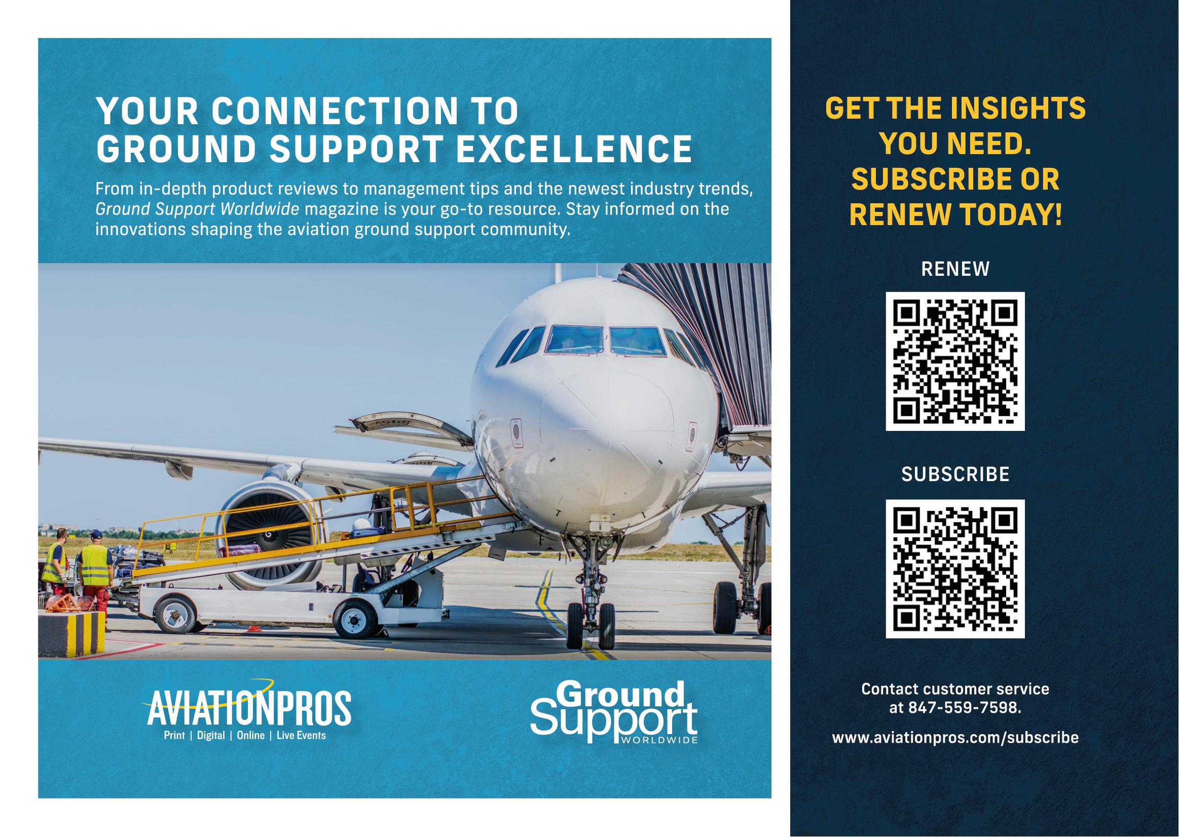 SUBSCRIPTIONS: Individual print and digital subscriptions are available without charge to qualified subscribers worldwide. Please visit www.aviationppros.com and click on “Subscribe”. Publisher reserves the right to reject non-qualified subscriptions. Subscription prices: U.S. $65.00 per year, $127.00 two years; Canada/Mexico $96.00 per year, $178.00 two years; All other countries $140 per year, $264.00 two years. Back issue $15 prepaid, if available. All subscriptions payable in U.S. funds. Canadian GST #842773848. Send subscription inquiries to Ground Support Worldwide, PO Box 3257, Northbrook, IL 60065-3257. Customer service can be reached toll-free at 877-382-9187 or at circ.groundsupportww@omeda.com for magazine subscription assistance or questions.