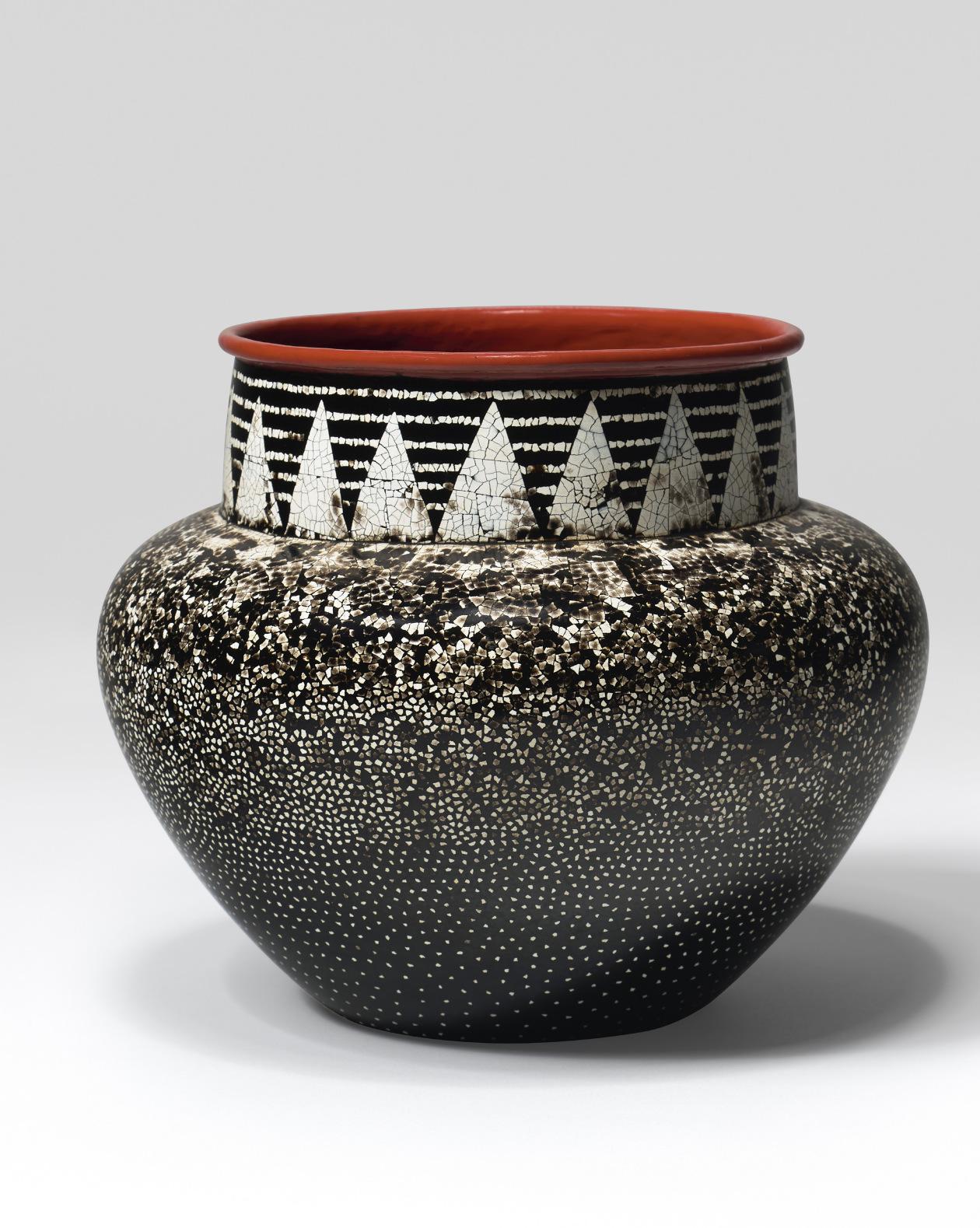 Dunand’s use of eggshell inlay was equally groundbreaking. He refined this demanding technique to a level unmatched in the West. Under his hand, eggshell became a structural component—tiny fragments forming a crackled, mosaic-like surface set into lacquer. The geometric order of these patterns places them firmly within modern design, while their natural irregularity evokes organic processes of fracture and growth. In the Edlis | Neeson group, some vessels display exceptionally fine, almost textile-like eggshell fields. Others feature more varied patterns that give the surface a lively, shimmering texture. This balance between control and spontaneity reflects Dunand’s belief in materials as active and living elements: a philosophy that shaped his entire career. The importance of this group of works lies not only in their artistry but also in their exceptional provenance, connected to two of the most significant collectors of French modernism.