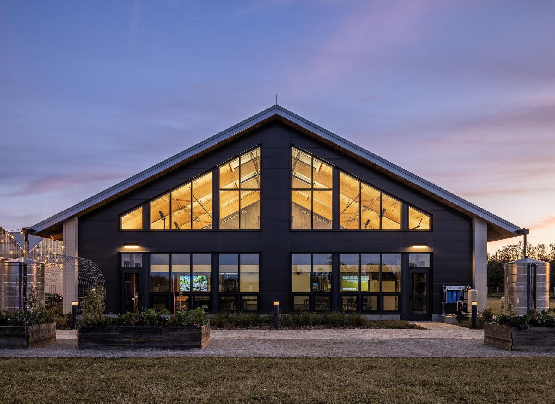 A mass timber education building lives at the heart of the campus and is designed to meet the Living Building Challenge Material Petal and achieve net-positive performance. Flexible indoor-outdoor classrooms extend learning into the farm, supporting nearby colleges with regenerative agriculture curriculum and local community workshops.
