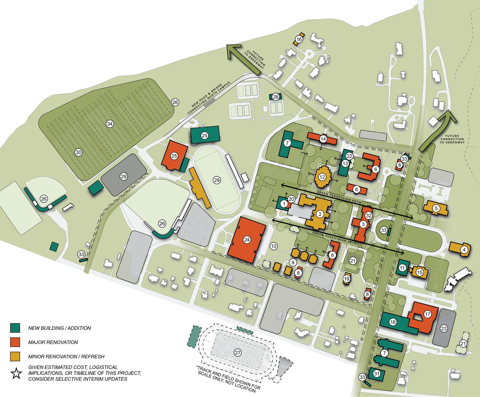 Created in close collaboration with University Leadership, Advancement, and Marketing, the plan is carefully aligned with the Comprehensive Campaign Case Statement. This alignment ensures that each capital project included in the campaign is accurately depicted and clearly communicated. The plan not only offers a practical roadmap for campus development—it also includes the level of architectural detail needed to support donor engagement and campaign-specific activities tied to individual spaces.