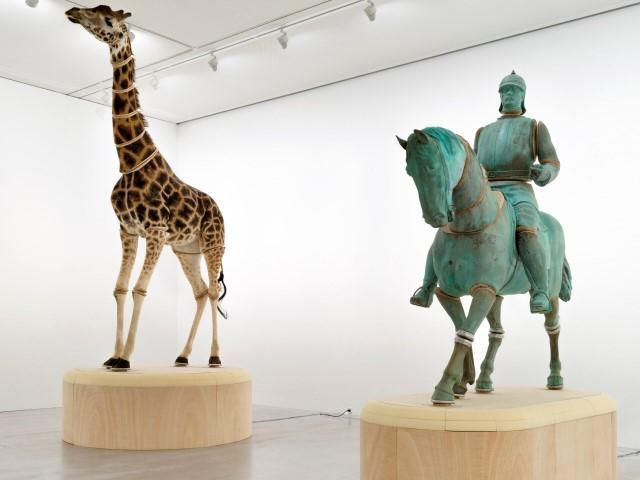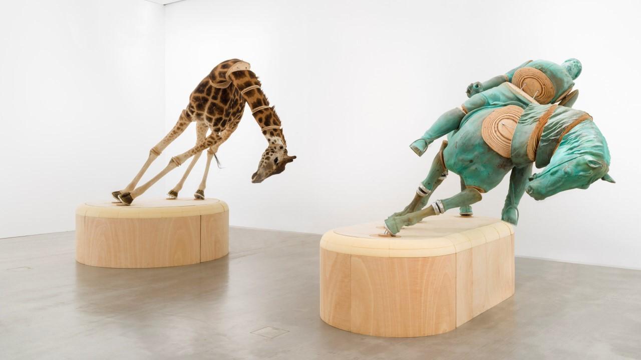 In his sculpture The Elephant in the Room (Giraffe), Jonathon van Bismarck has constructed a large life-sized sculpture of a giraffe. What separates this piece existing simply as stationary taxidermy is its kinetic element. Overtime the giraffe, standing proud, will collapse and its segmented figure will reveal itself as it hangs lifelessly. To Glitch, as stated previously, is an act of error. It has corrupted the integrity of the giraffe, piece by piece – like a slow poison. The viewers must helplessly witness overtime the inevitability of failure, which in the form of animal becomes a reflection of the condition of the natural world.
