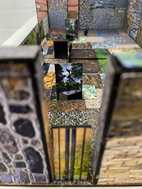 addicted to the presence of technology, almost like a safety net in the unfamiliar natural world By utilising this design in the context of this exhibition, the landscape of Dundee city becomes reflected. In the surface of this cube, both the modern renovations and ruins of the past collide in its image. The mirrors literally reflect humanity’s capitalist motives at such great scale that make contemplation of our surroundings impossible to avoid. Beyond this clean, pristine and illusionary cube, the landscape of Dundee city is reflected: both the modern renovations and ruins of the past