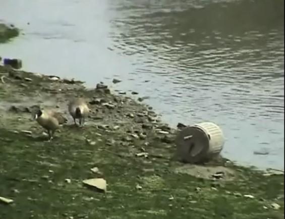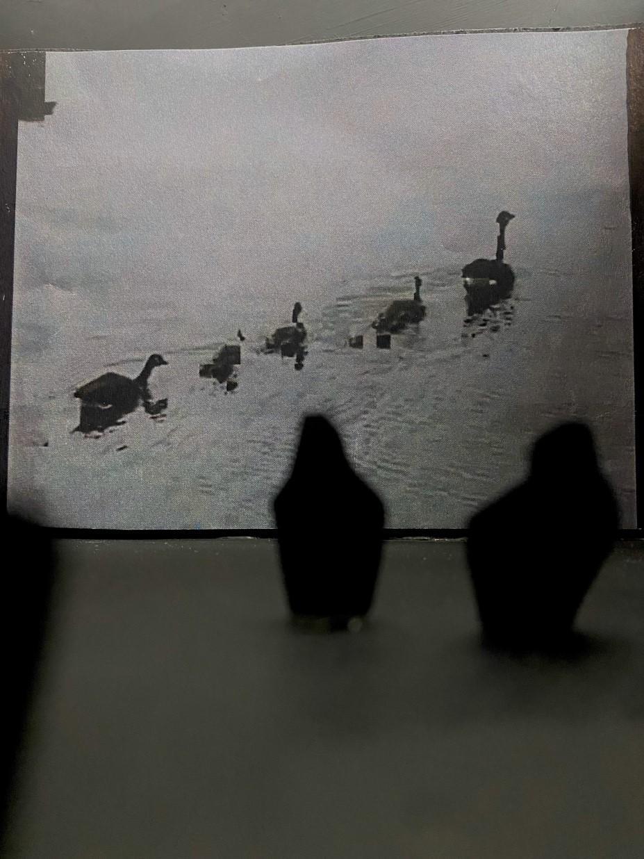 As a part of her installation Dumplinks, Iris Garrelfs created a 3 minute and 36 second video piece. In the short film, we see long shots of a family of geese living upon a trash-piled riverbed In this instance, the Glitch reveals itself sporadically, acting as a symbol of disruption as it follows the birds like a predator (Garrelfs, 2008) This specific work embodies the Glitch in a form that directly communicates the curatorial thesis of this exhibition By utilising the Glitch’s ability to interrupt, we can begin to recognise and contemplate technology’s poisonous presence in nature. By projecting this piece at a large scale on a wall, the viewer becomes more involved in the artwork. When their shadow obstructs the projection, they are reminded of the role they play in this polluted habitat.