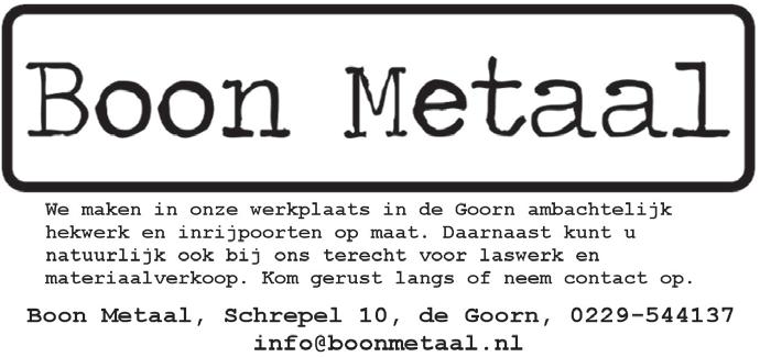portie 6,95 Je duurzame (t)huis? Energiebesparing via de hypotheek? In een duurzame woning is het fijn wonen, bovendien bespaar je op je energierekening. Wij vertellen je graag meer. 0229-544333 braasenpartners.nl Woodstock zoekt personeel kijk op woodstock-vloeren.nl/personeel-gezocht Kom langs op zaterdag Bel voor info: 06-28083528 Meiland 17 in Obdam GROOTSTE ASSORTIMENT ZWEMBADEN IN Noord-Holland! Intex Ø366 x 99 cm 199.van 239,Keuze uit meer dan 50 modellen www.deboet.nl 7 dagen per week open! TUIN-, SFEER- & KLUSCENTRUM