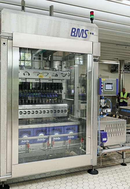 Die Bierflaschen werden befüllt und sofort verschlossen. Anschließend wird der Füllstand kontrolliert, die Flaschen werden abgespült und danach etikettiert. SchließlichpackteineBMS-PortalmaschineUnipack2 0 dieFlascheninKisten,dieanschließendzurPalettierung insLagertransportiertwerden.Hierkommendiebeiden BMS-PalettiererUnipal105erneutzumEinsatz,jetztzur Palettierung der Bierkästen. Somit schließt sich der Materialkreislauf
