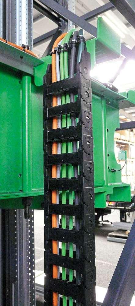 Liste mit den nötigen Daten an Igus “ Dieses Verfahren undauchdieBelegungderKettensowiedieAuswahlder Chainflex-LeitungenhabendieKonstrukteuremitdem Igus-Verkaufsberaterabgestimmt.Dasgiltnichtnurfür die Module-Connect-Systeme an den Hebern, sondern auch für das Module-Connect-Leitungspaket vom Rack zum Schaltschrank.
