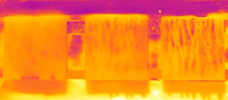 patterns, such as cottonwood bark, will enhance evaporative cooling by increasing surface area and moisture absorption, further contributing to heat reduction. panels cooled the higher extrusions, regardless of water application technique. One methodology displayed a greater difference in effective cooling. The heavy rain cooling capacity in relationship of time exposed to air flow. Over the drying period, extrusions began to exhibit higher temperatures due to their exposure to the sun, while self-shades to the point where evaporation is delayed. Other thermal studies could be further improved by a different mounting solution dependent on application, such as submerged for 3-minutes shows that wood backing versus open air can alter evaporative cooling rate. A prolonged study could better demonstrate more defined results as our submersion, climate, and panel materiality. One sustainable example could be terracotta, as proposed in the original hypothesis due to its light weight and porous qualities.