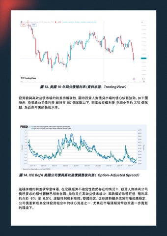 投資級與高收益債市場的利差持續收斂,顯示投資人對信貸市場的信心依舊強勁。如下圖 所示,投資級公司債利差維持在 90 個基點以下,而高收益債利差亦縮小至約 270 個基 點,為近兩年來的最低水準。