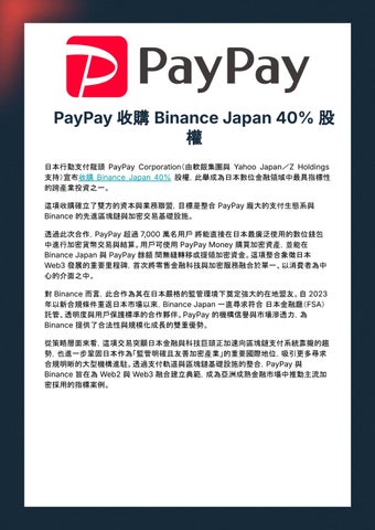 日本行動支付龍頭 PayPay Corporation(由軟銀集團與 Yahoo Japan/Z Holdings 支持)宣布收購 Binance Japan 40% 股權,此舉成為日本數位金融領域中最具指標性 的跨產業投資之一。