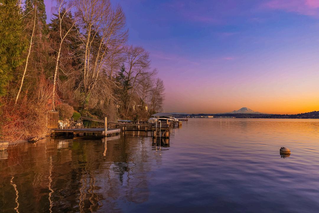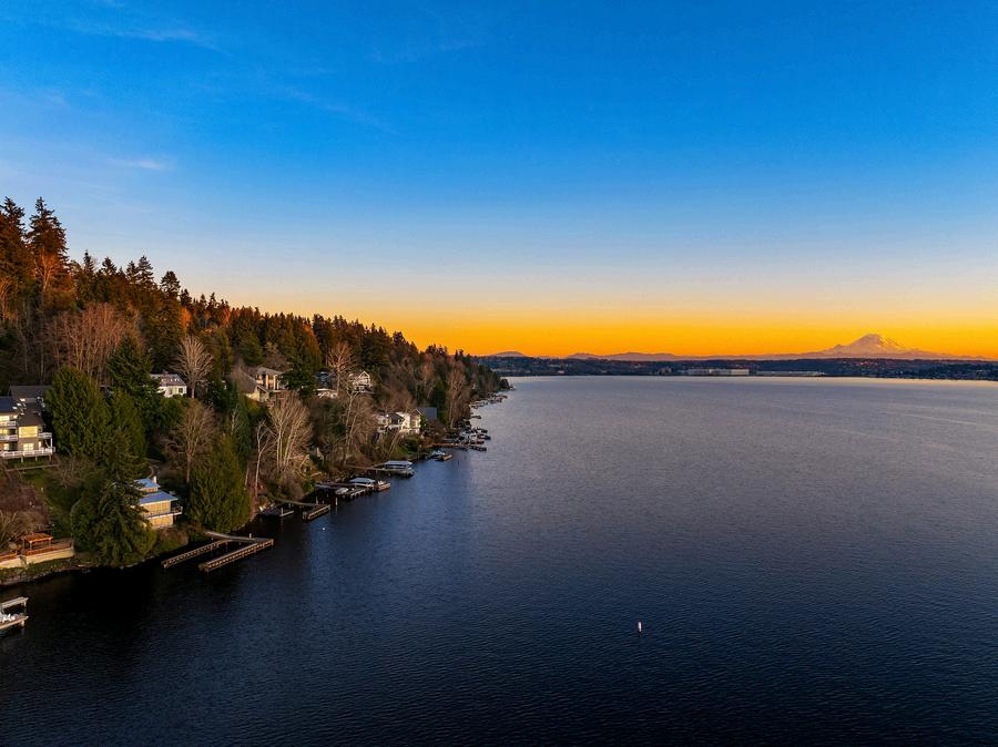 There’s something quietly majestic about the southwest-facing views from Mercer Island. As the day begins or winds down, the light moves in golden layers across the lake, softening the sky and warming the water. The light makes a long, beautiful arc across the island our tall tree canopy sends the east side into shade early, while the west basks in long afternoons of sun yet misses the soft quiet of sunrise From these southwest vantage points, Mount Rainier often rises in the distance like a dream its silhouette shifting from blush pink at sunrise to deep lavender at sunset. On clear evenings, the mountain glows just beyond the horizon while the sky melts into amber and coral, mirrored perfectly in the lake below. The sunsets here aren’t loud or dramatic they're spacious and generous, the kind that invite you to exhale, to sit a little longer, and to take in just how lucky we are to live in view of something so breathtaking