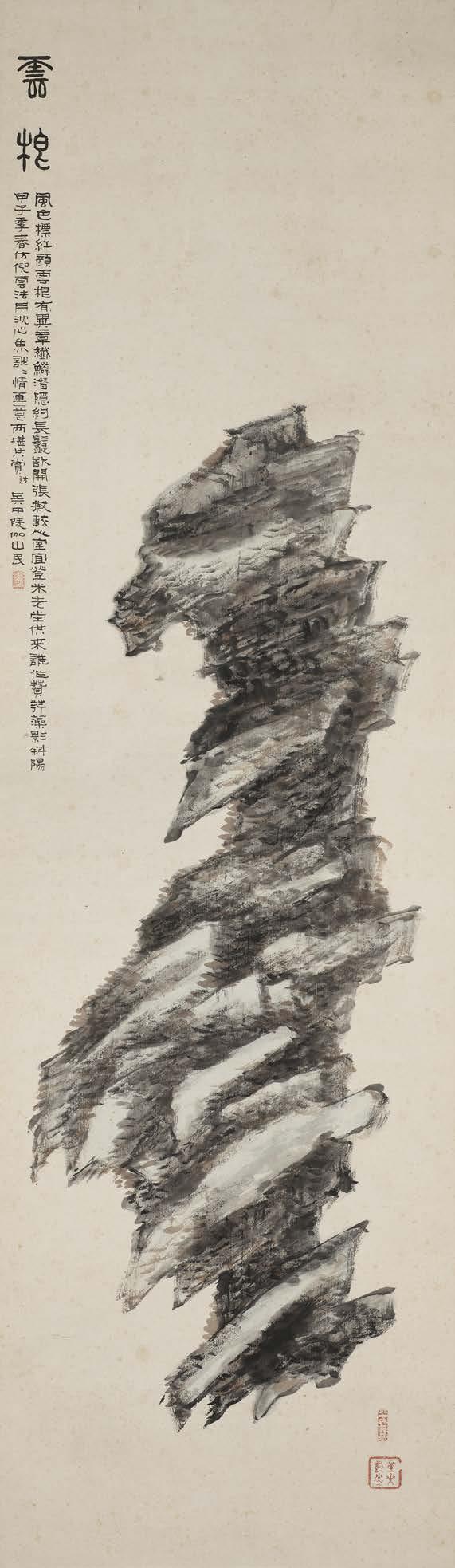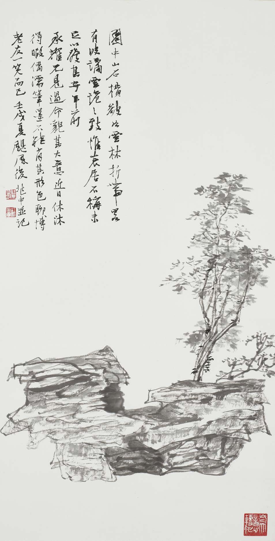 水墨紙本 立軸 一九八二年作 題識:園中山石橫皴如雲林折帶,略有波譎雲詭之致。惟荒居不稱,未足以 發其奇。年前承耀兄見過,命貌其大意,近日休沐得暇,偶濡筆墨,不能肖 其形色,聊博老友一笑而已。壬戌(1982 年)夏颶風後,兆申並記。 鈐印:略無丘壑、江兆申印、老大意轉拙