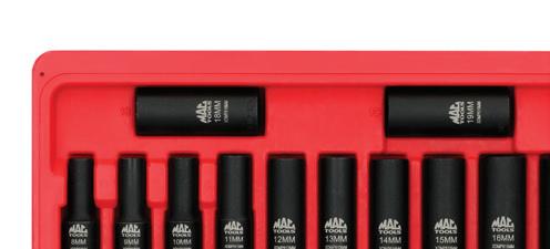 The 12-pc 3/8” Drive Metric Deep Magnetic Impact Socket Set from Mac Tools includes sizes 8-19mm and is ideal for work in tight areas. The magnetic feature holds new or extracted nuts and bolts, and the spring-loaded magnet allows for use on long bolts.