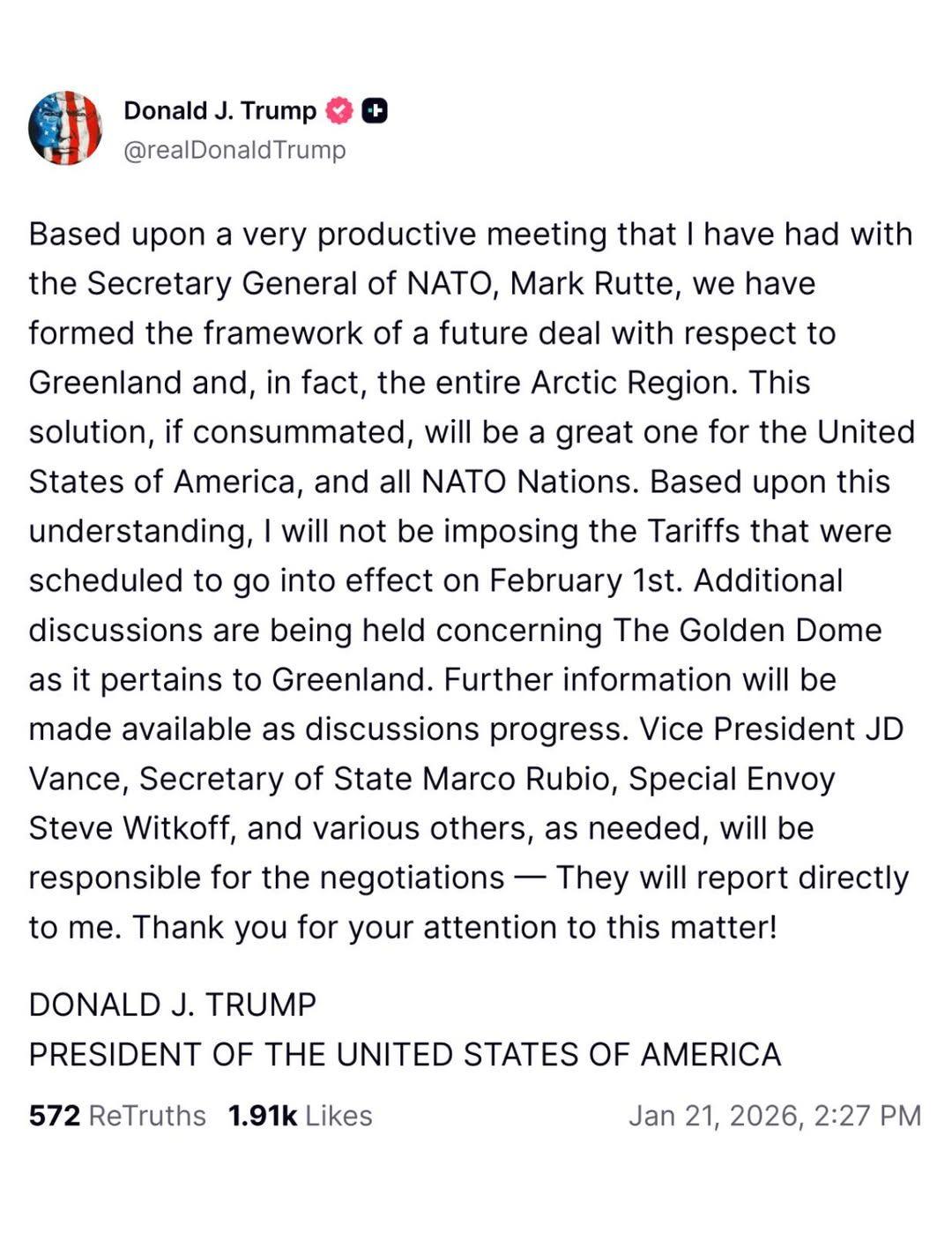 Tuynhiên,saukhiôngTrumprútlạicáclờiđedọaápthuếvàloạibỏkhảnăngcan thiệp quân sự tại Greenland trong bài phát biểu tại Diễn đàn Kinh tế Thế giới ở