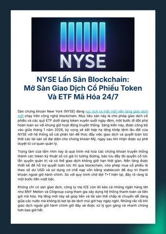 Sàn chứng khoán New York NYSE) đang rục rịch ra mắt một nền tảng giao dịch mới chạy trên công nghệ blockchain. Mục tiêu sàn này là cho phép giao dịch cổ phiếuvàcácquỹETFdướidạngtokenxuyênsuốtngàyđêm,mộtbướcđiđộtphá hoàntoànsovớikhunggiờhoạtđộngtruyềnthống.Sángkiếnnày,đượccôngbố vào giữa tháng 1 năm 2026, kỳ vọng sẽ kết hợp hạ tầng khớp lệnh lâu đời của NYSE với hệ thống sổ cái phân tán để thúc đẩy việc giao dịch và quyết toán tức thờicáctàisảnsốđạidiệnchochứngkhoánMỹ,ngaysaukhinhậnđượcsựphê duyệttừcơquanquảnlý.