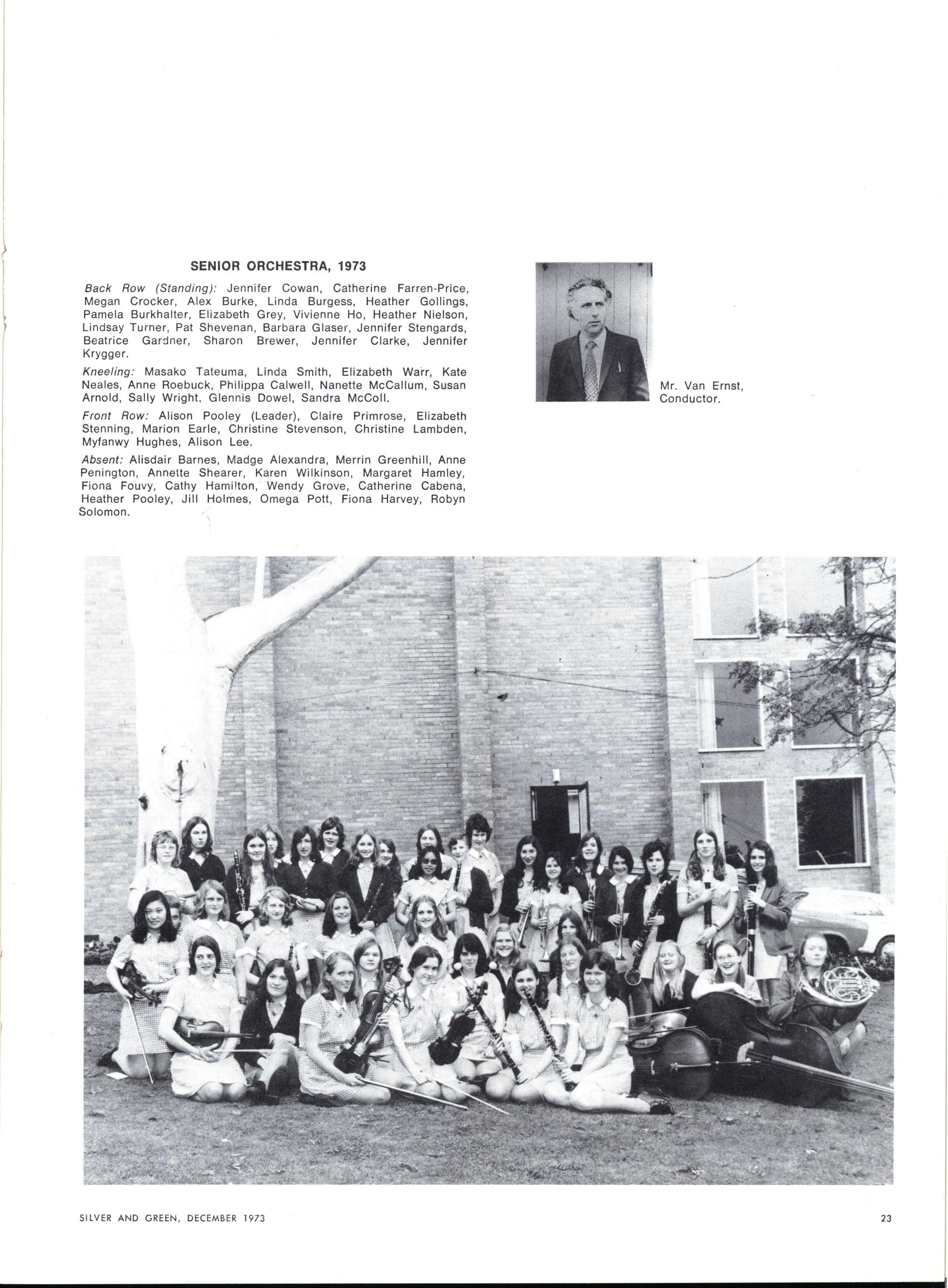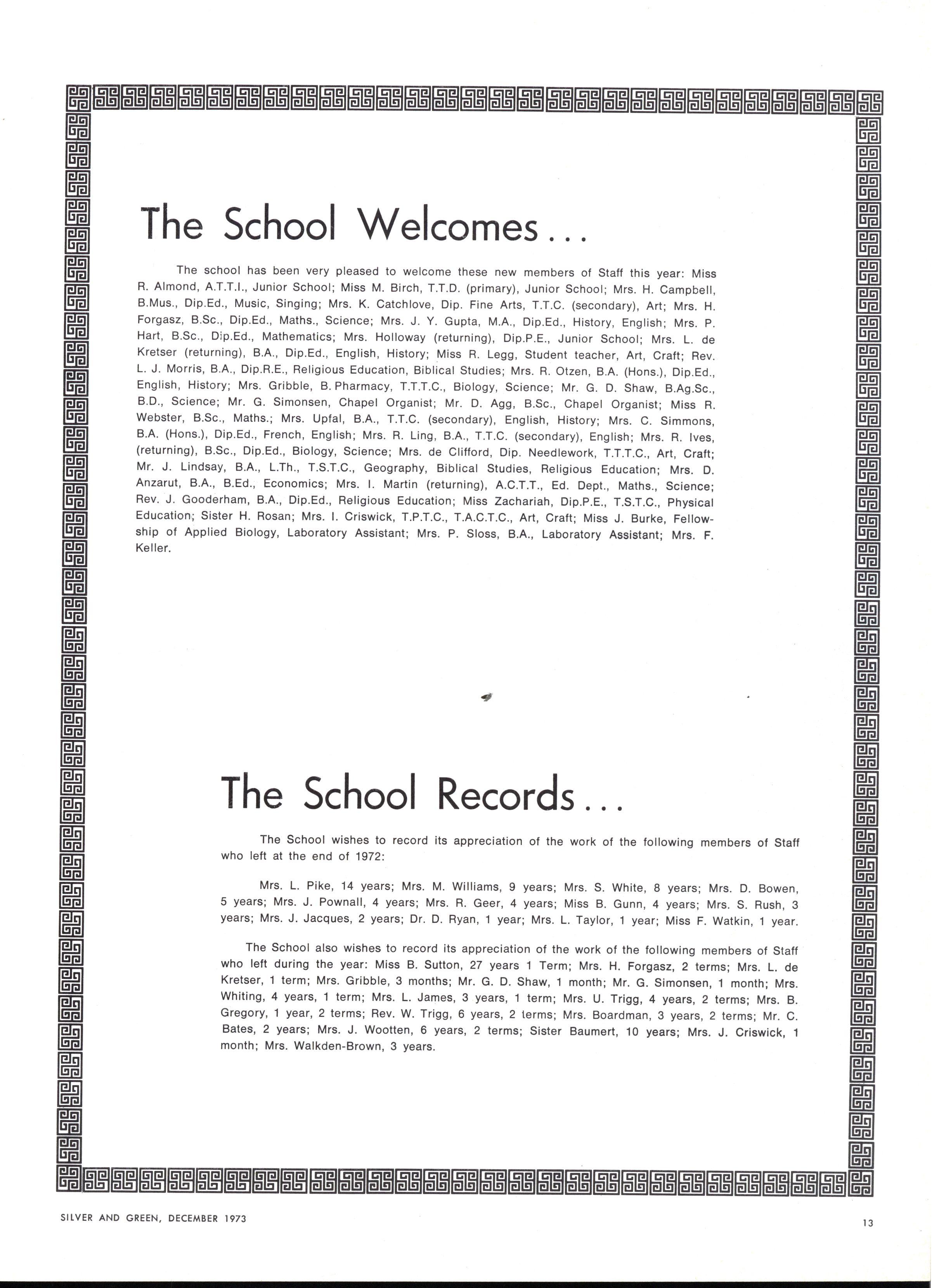 The school has been very pleased to welcome these new members of Staff this year: Miss R Almond, A.T.T.I., Junior School; Miss M Birch, T.T.D (primary), Junior School; Mrs H Campbell, B.Mus., Dip.Ed., Music, Singing; Mrs, K Catchlove, Dip Fine Arts, T.T.C (secondary), Art; Mrs H Forgasz, B.Sc., Dip.Ed., Maths., Science; Mrs J Y Gupta, M.A., Dip.Ed., History, English; Mrs P Hart, B.Sc., Dip.Ed., Mathematics; Mrs Holloway (returning), Dip.P.E., Junior School; Mrs L de Kretser (returning), B.A., Dip.Ed., English, History; Miss R Legg, Student teacher, Art, Craft; Rev L J Morris, B.A., Dip.R.E., Religious Education, Biblical Studies; Mrs R Otzen, B.A (Hons.), Dip.Ed., English, History; Mrs Gribble, B Pharmacy, T.T.T.C., Biology, Science; Mr G D Shaw, B.Ag.Sc., B.D., Science; Mr G Simonsen, Chapel Organist; Mr D Agg, B.Sc., Chapel Organist; Miss R Webster, B.Sc., Maths.; Mrs Upfal, B.A., T.T.C (secondary), English, History; Mrs C Simmons, B.A (Hons.), Dip.Ed., French, English; Mrs R Ling, B.A., T.T.C (secondary), English; Mrs R Ives, (returning), B.Sc., Dip.Ed., Biology, Science; Mrs de Clifford, Dip Needlework, T.T.T.C., Art, Craft; Mr J Lindsay B.A. L.Th. T.S.T.C. Geography Biblical Studies Religious Education; Mrs D Anzarut, B.A., B.Ed., Economics; Mrs I Martin (returning), A.C.T.T., Ed Dept., Maths., Science; Rev, J Gooderham, B.A., Dip.Ed., Religious Education; Miss Zachariah, Dip.P.E., T.S.T.C., Physical Education; Sister H Rosan; Mrs I Criswick, T.P.T.C., T.A.C.T.C., Art, Craft; Miss J Burke, Fellowship of Applied Biology, Laboratory Assistant; Mrs P Sloss, B.A., Laboratory Assistant; Mrs F Keller