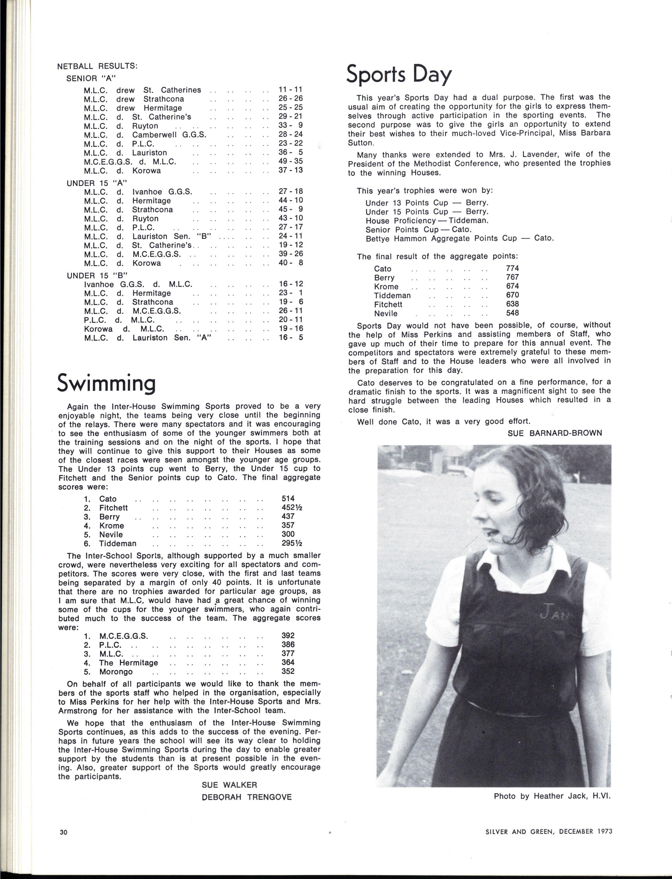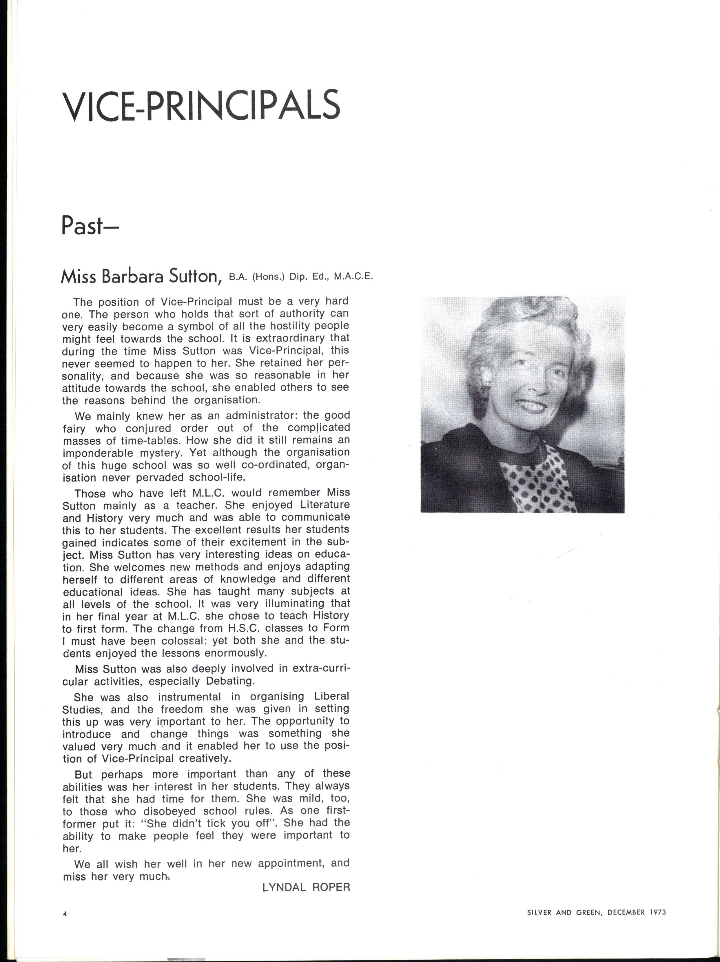 During the year we have seen a number of changes in the positions of leadership at M.L.C Miss Barbara Sutton, B.A., Dip.Ed., who had been on the College Teaching Staff for more than twenty-seven years, and since 1967 had served as Vice-Principal, left at the end of Term I to become Headmistress of Camberwell Church of England Girls' Grammar School. We thank Miss Sutton for her splendid service and wish her well in her important new task