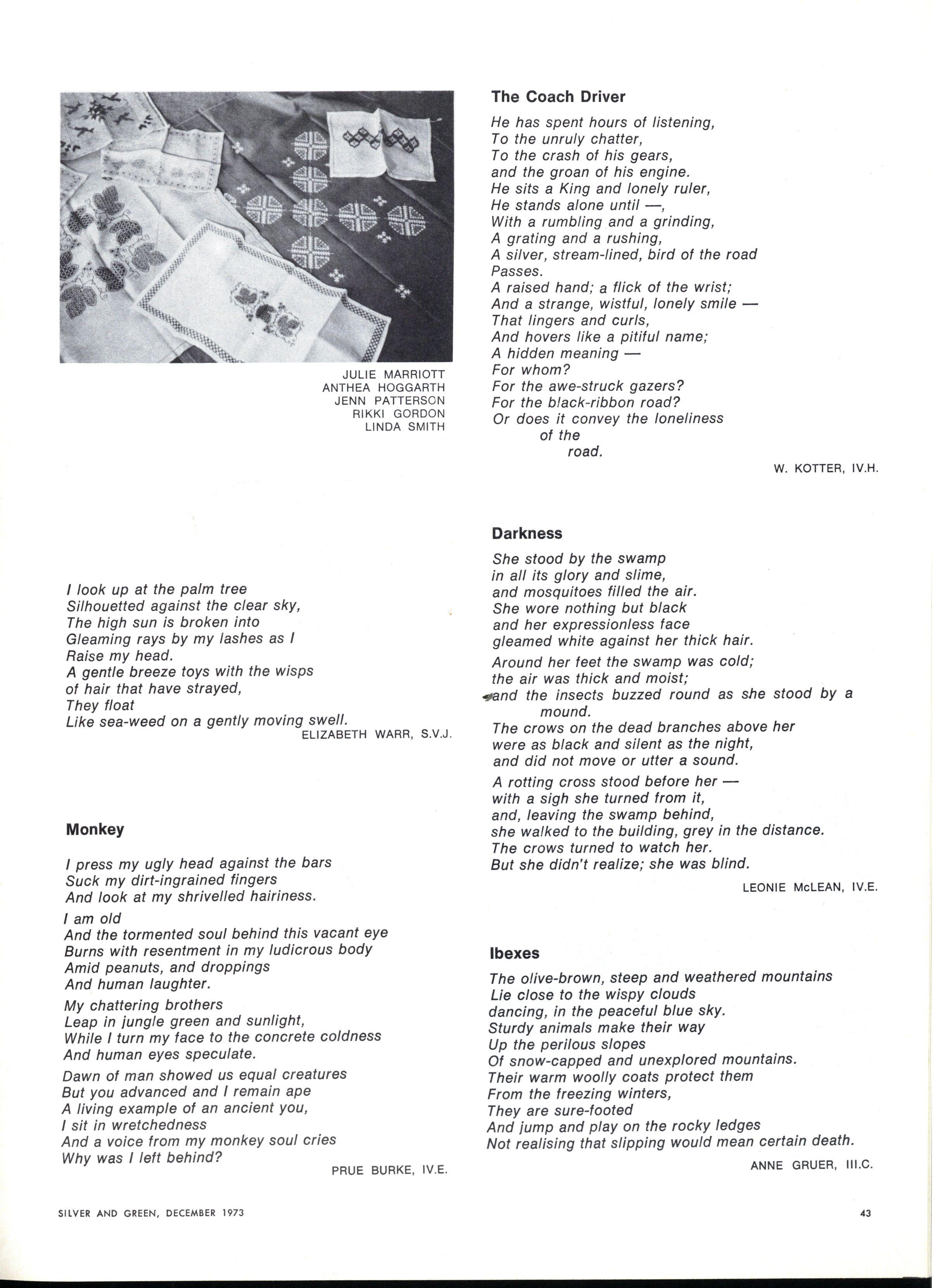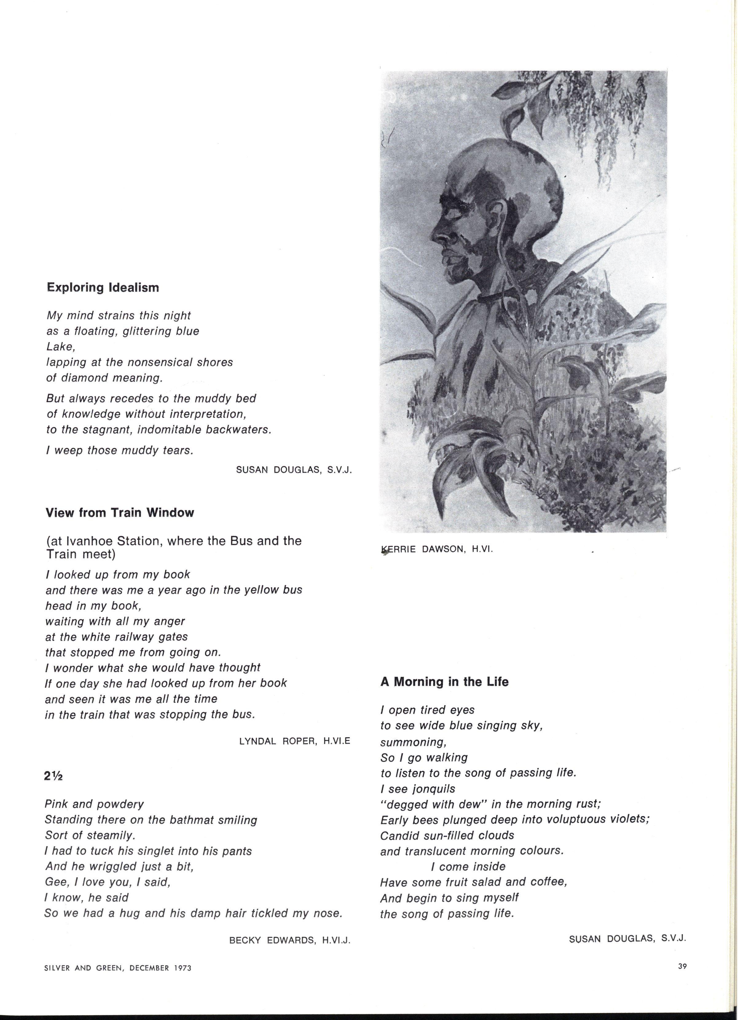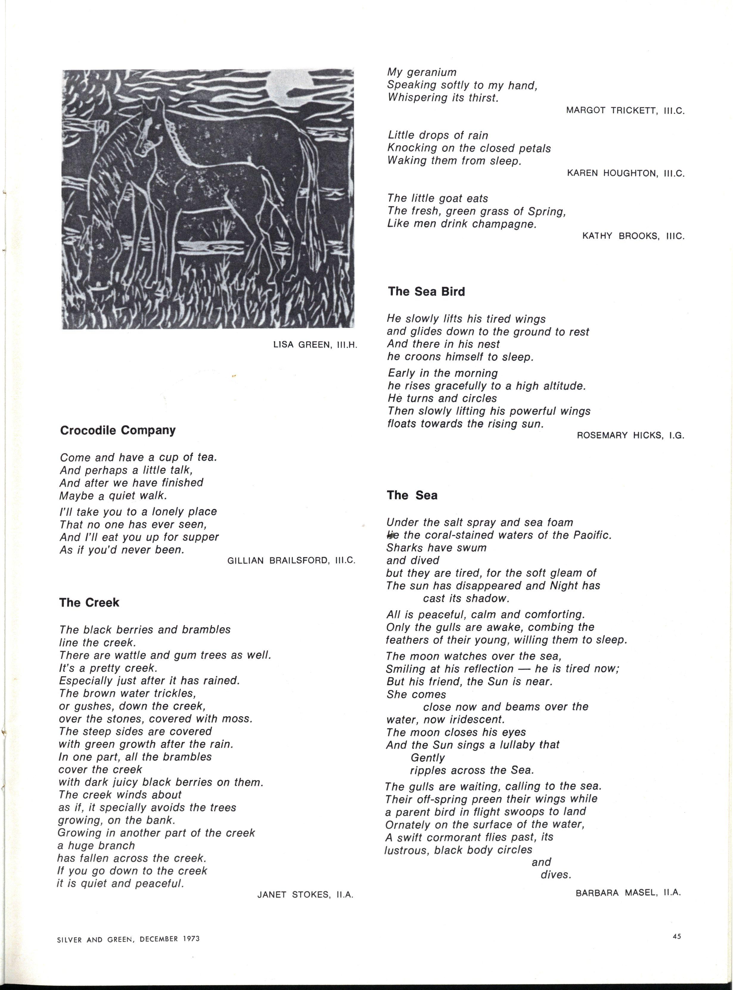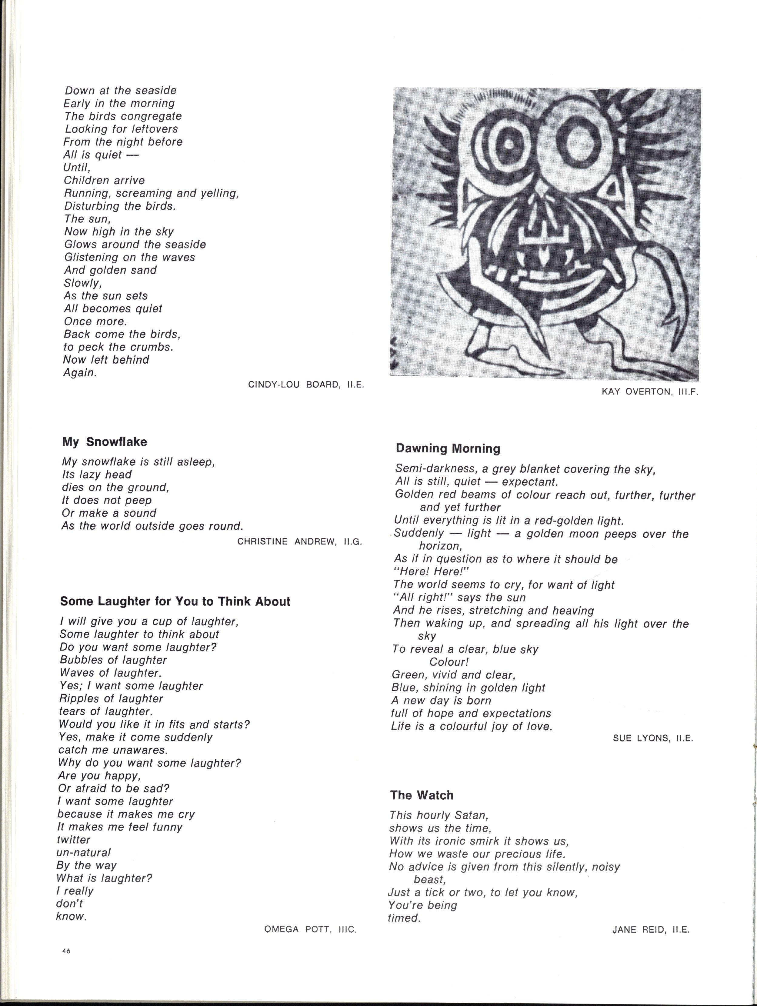 Perhaps an even more difficult question arose when we tried to work out what we were doing in the Creative Section Should we include the "best" work submitted or should we try to print as much as possible? We could not find an answer to this question On the one hand, it seemed important to produce what we thought was a "good" selection: on the other, we felt we ought to be encouraging as many people as possible to write We ended up sitting squarely on the fence (and that is an uncomfortable and precarious position!) not really happy with what we were doing and unable to reconcile the two roles.