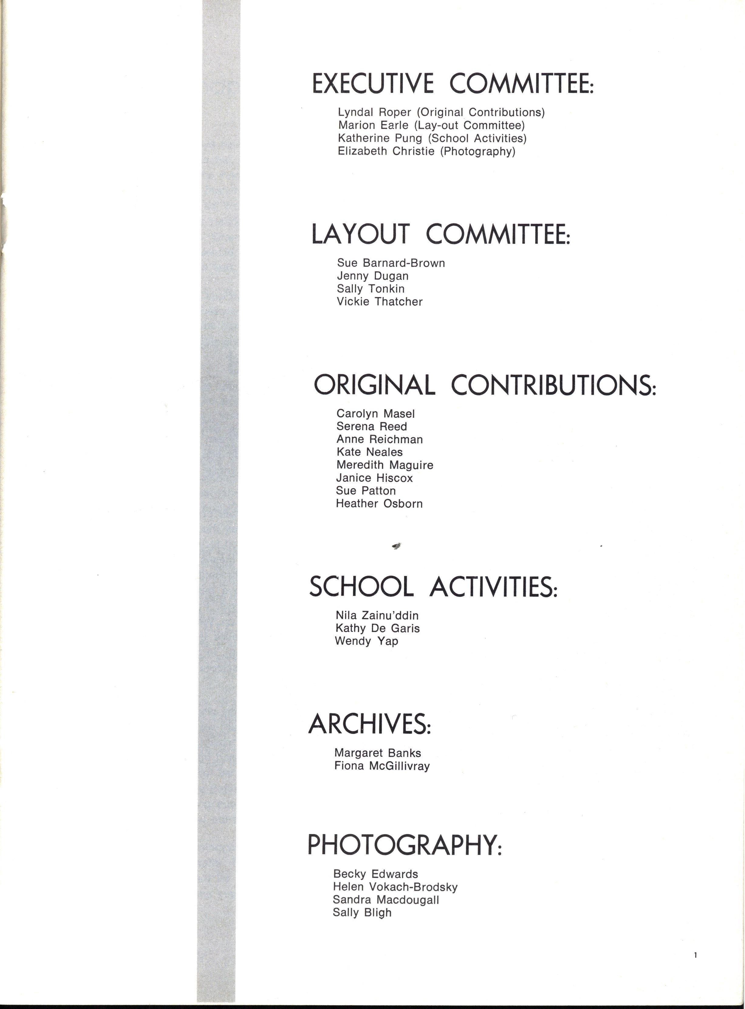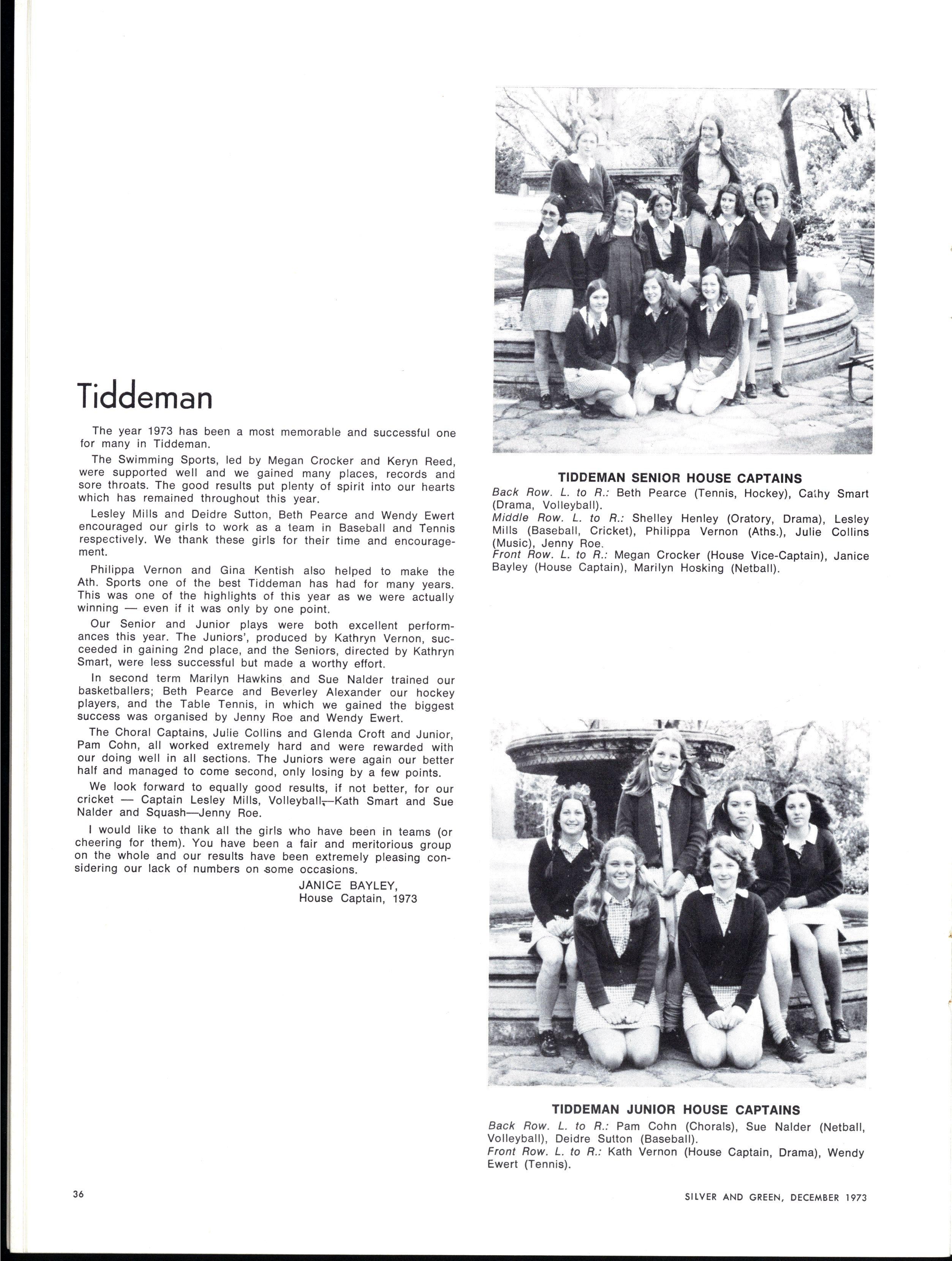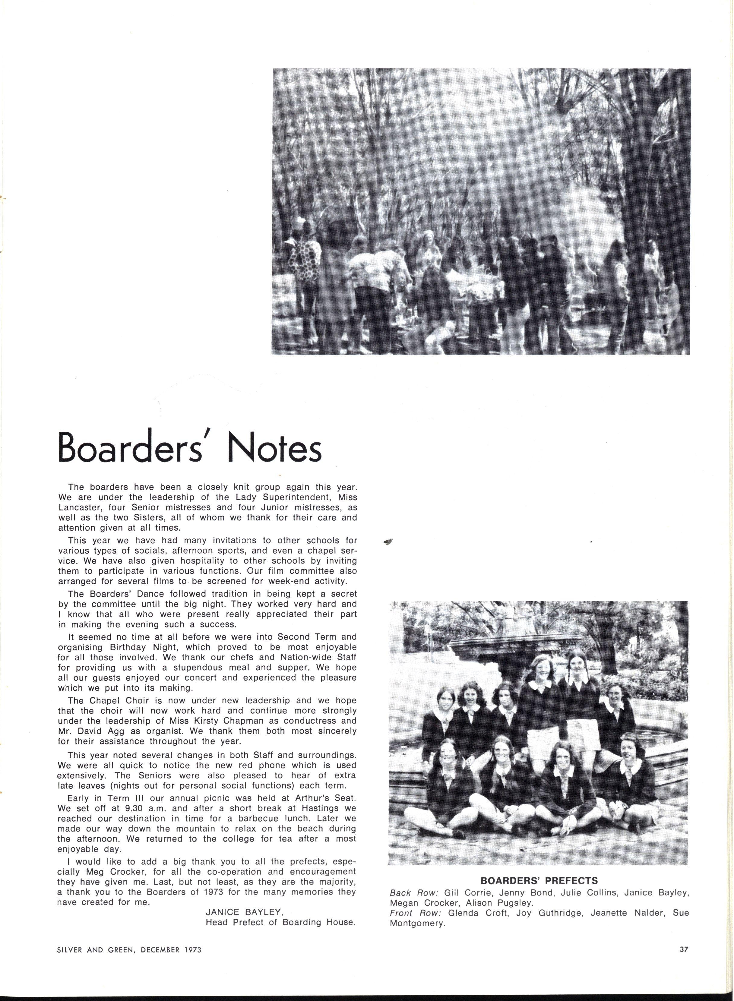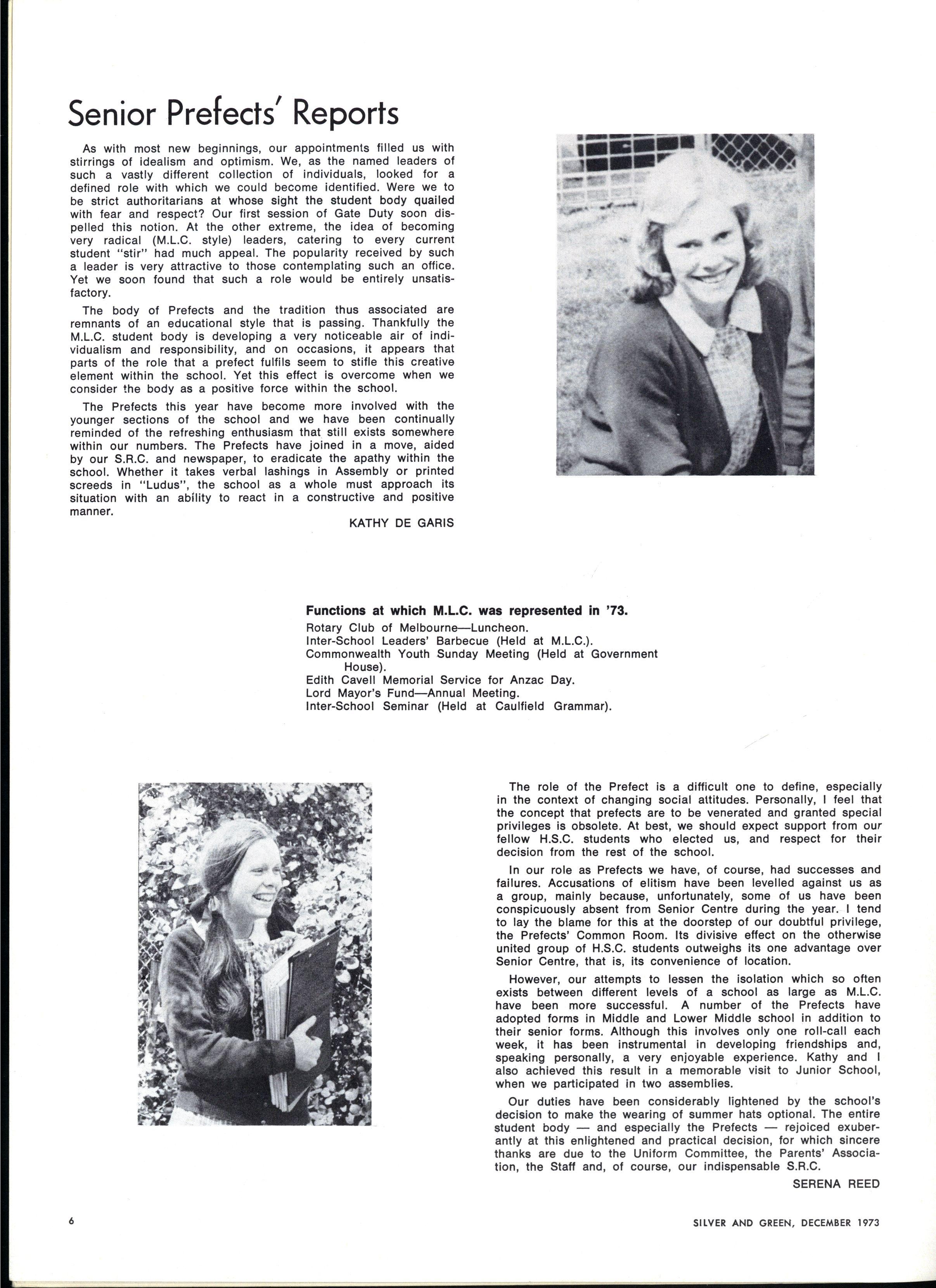 As with most new beginnings, our appointments filled us with stirrings of idealism and optimism We, as the named leaders of such a vastly different collection of individuals, looked for a defined role with which we could become identified Were we to be strict authoritarians at whose sight the student body quailed with fear and respect? Our first session of Gate Duty soon dispelled this notion At the other extreme, the idea of becoming very radical (M.L.C style) leaders, catering to every current student "stir" had much appeal The popularity received by such a leader is very attractive to those contemplating such an office Yet we soon found that such a role would be entirely unsatisfactory