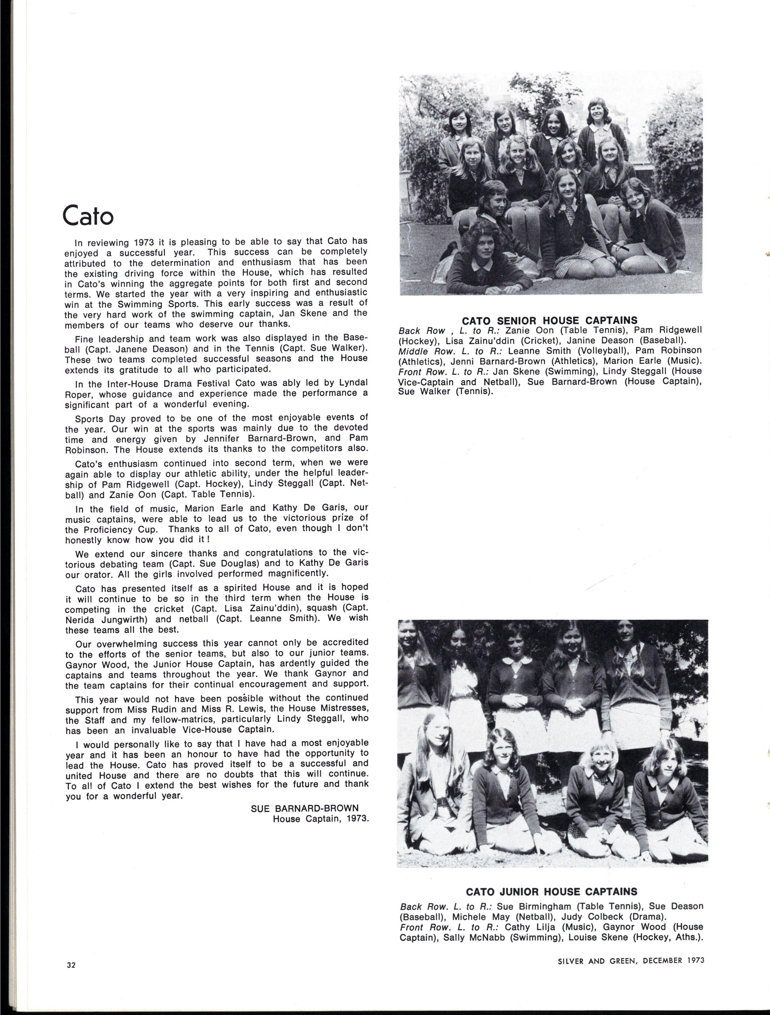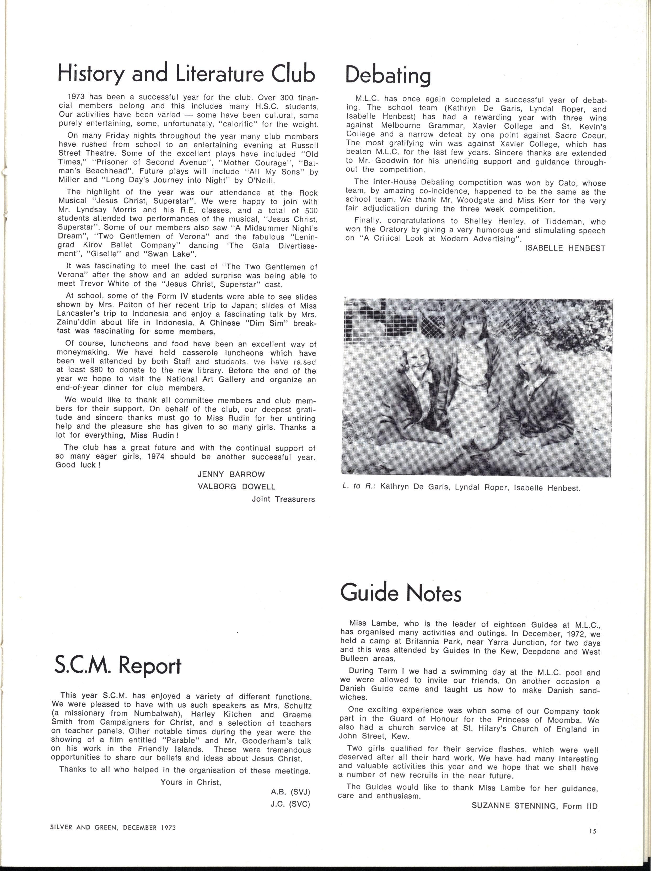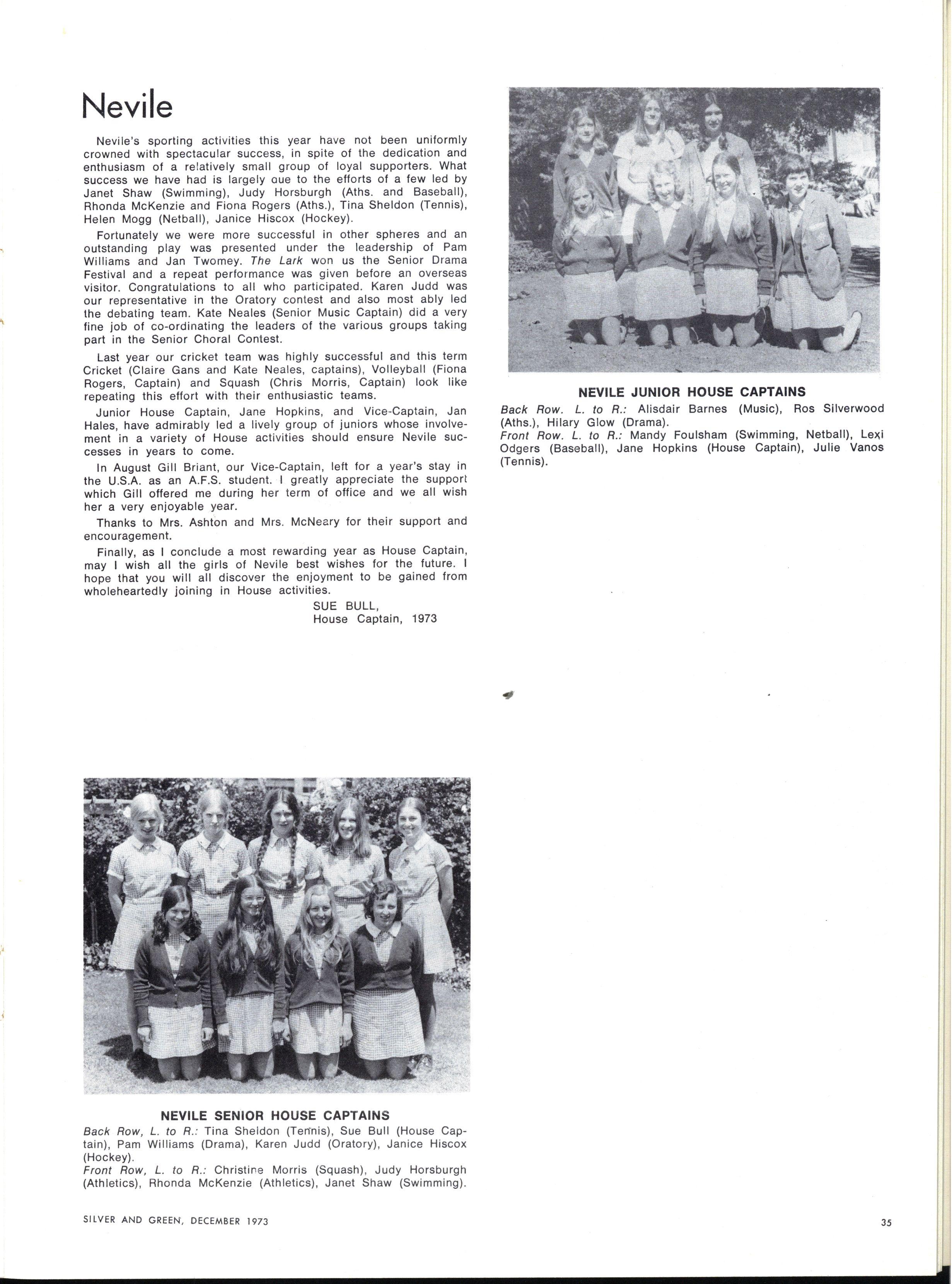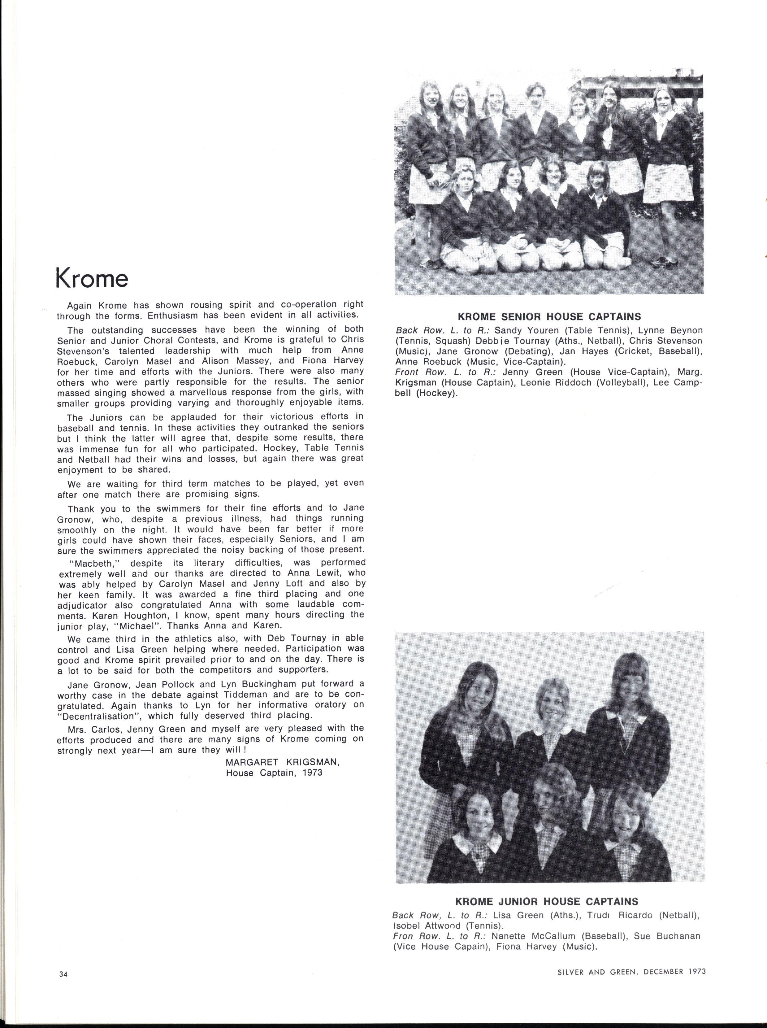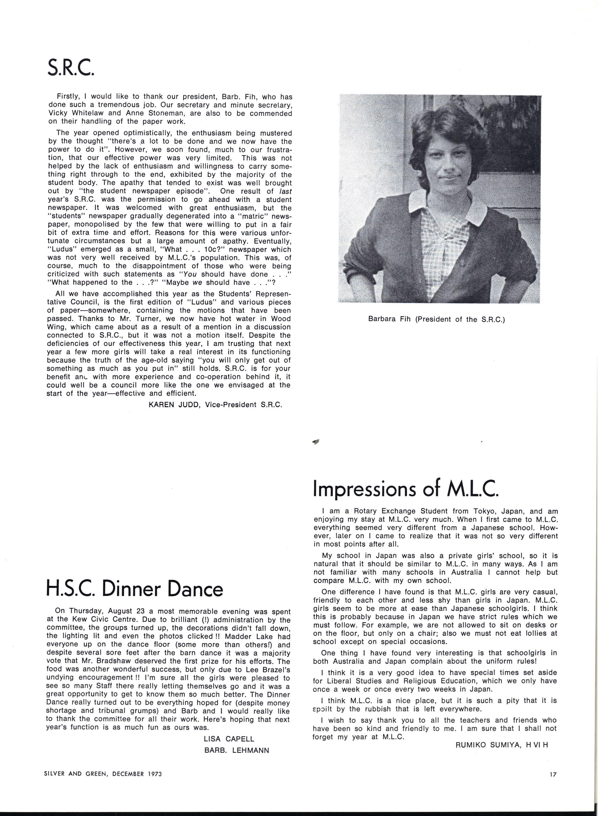 As with most new beginnings, our appointments filled us with stirrings of idealism and optimism We, as the named leaders of such a vastly different collection of individuals, looked for a defined role with which we could become identified Were we to be strict authoritarians at whose sight the student body quailed with fear and respect? Our first session of Gate Duty soon dispelled this notion At the other extreme, the idea of becoming very radical (M.L.C style) leaders, catering to every current student "stir" had much appeal The popularity received by such a leader is very attractive to those contemplating such an office Yet we soon found that such a role would be entirely unsatisfactory
